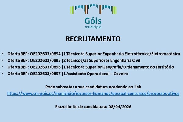 O Município de Góis tem procedimentos concursais abertos para reforço de equipas técnicas e operacionais. Estão em ...2026 Informação ao Munícipe -