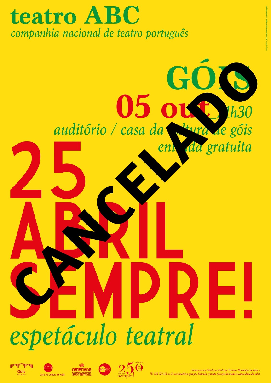 O Espetáculo Teatral “25 de Abril, Sempre!", da Companhia Nacional de Teatro Português - Teatro ABC - foi cancelado por motivos de força maior, alheios ao Município de Góis.