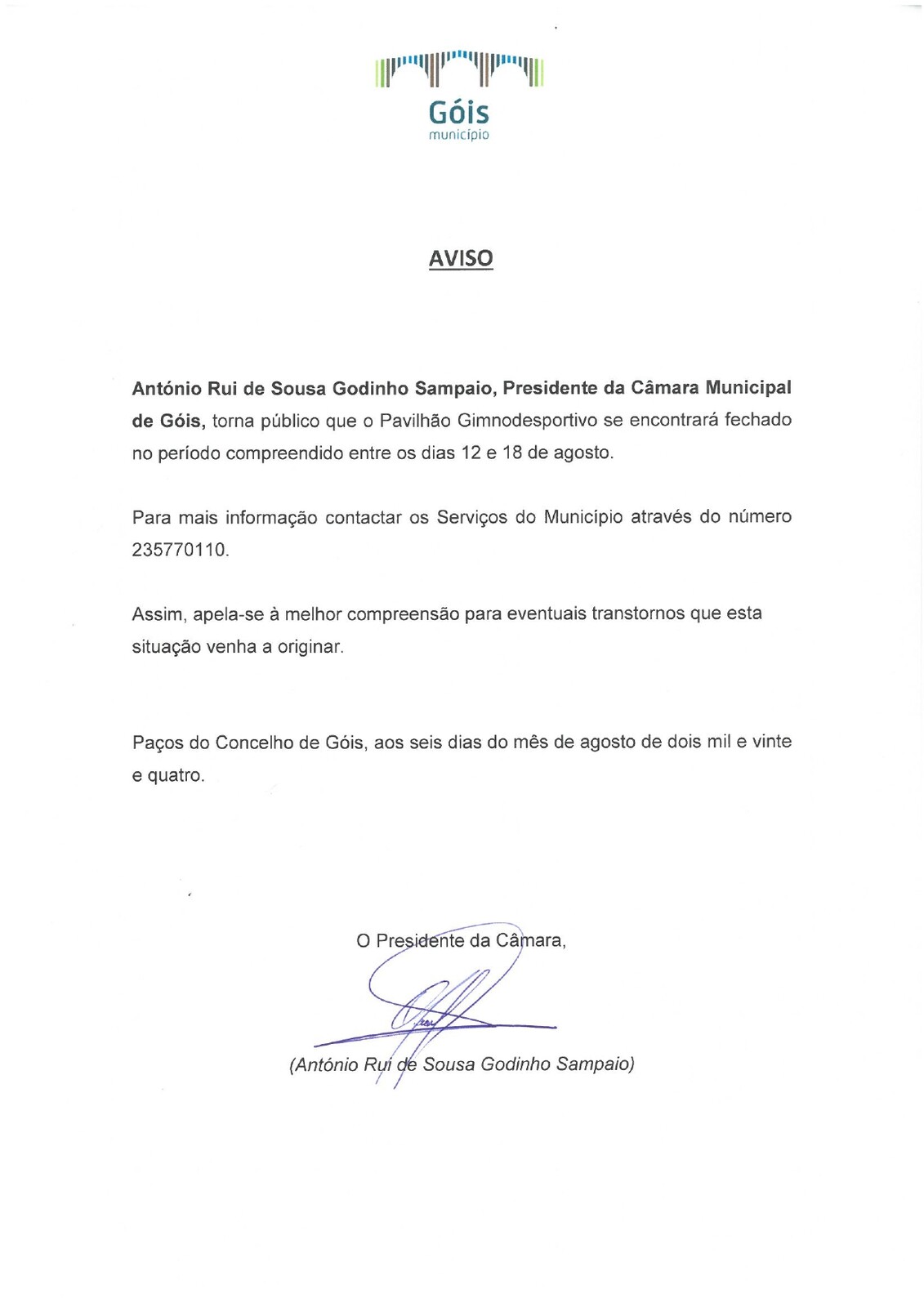 António Rui de Sousa Godinho Sampaio, Presidente da Câmara Municipal de Góis, torna público que o Pavilhão Gimnodesportivo se encontrará fechado no período compreendido entre os dias 12 e 18 de agosto.