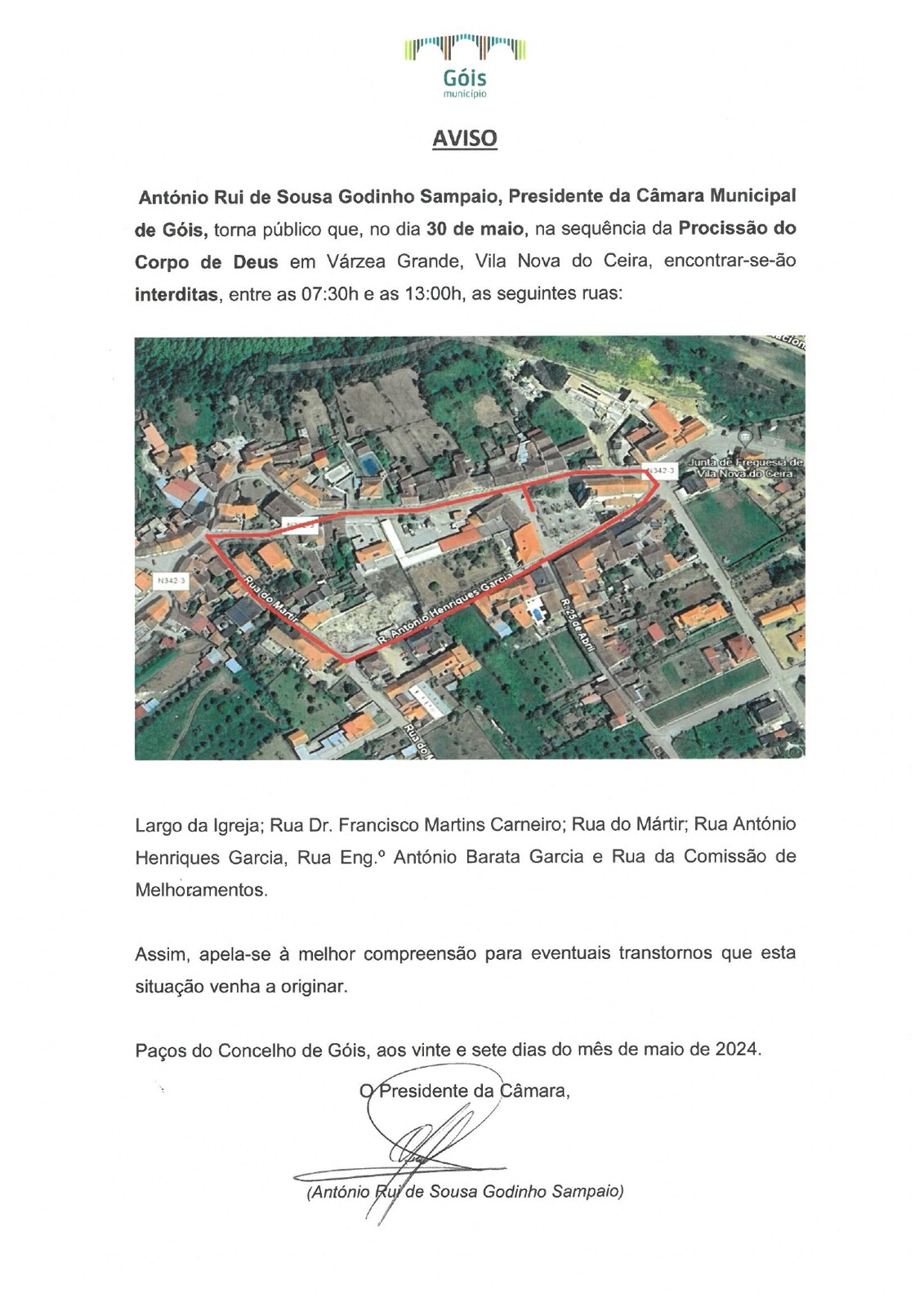 António Rui de Sousa Godinho Sampaio, Presidente da Câmara Municipal de Góis, torna público que, no dia 30 de maio, na sequência da Procissão do Corpo de Deus em Várzea Grande, Vila Nova do Ceira, encontrar-se-ão interditas, entre as 07:30h e as 13:00h, as seguintes ruas: