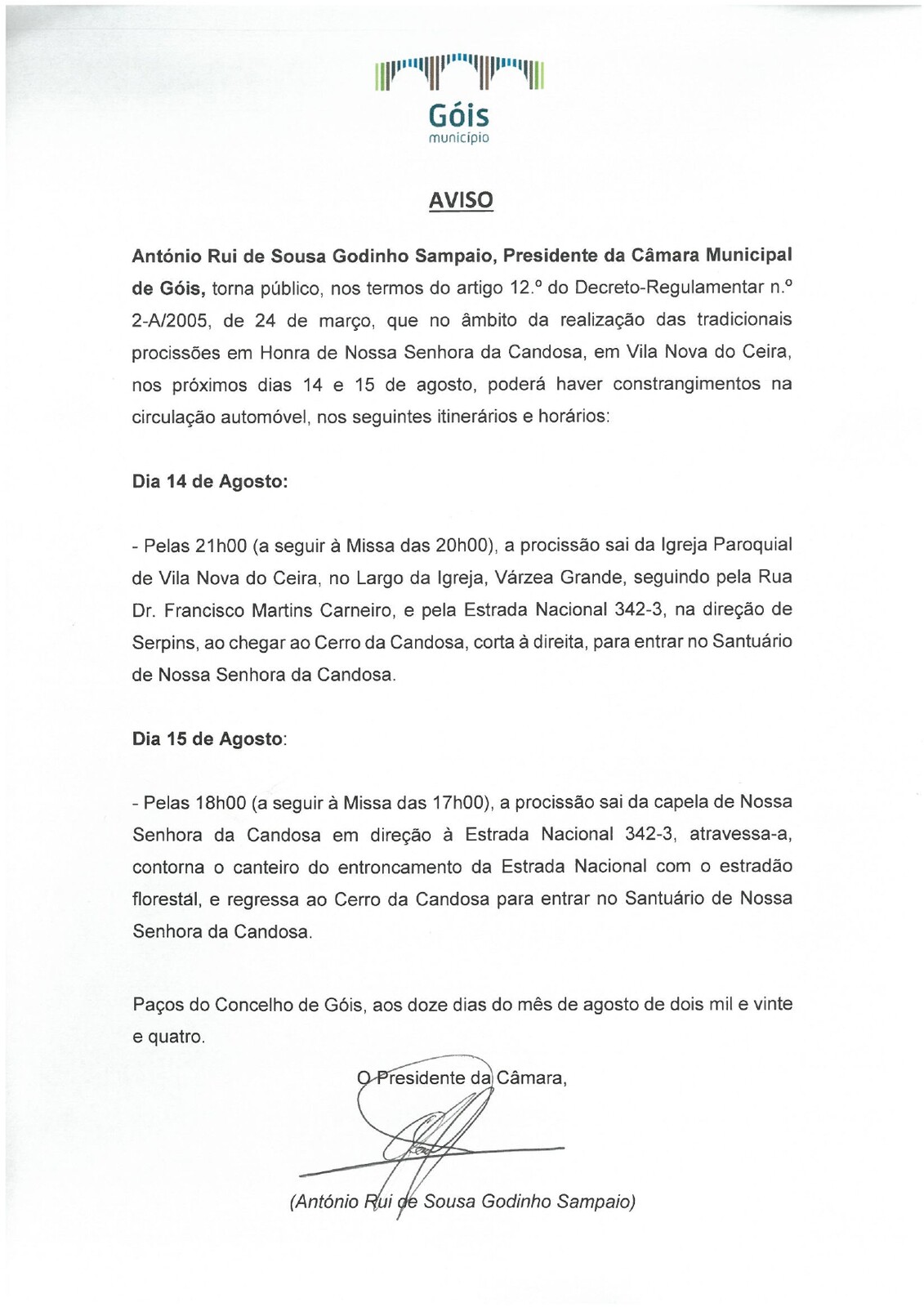 António Rui de Sousa Godinho Sampaio, Presidente da Câmara Municipal de Góis, torna público que, no âmbito da realização das tradicionais procissões em Honra de Nossa Senhora da Candosa, em Vila Nova do Ceira, nos próximos dias 14 e 15 de agosto, poderá haver constrangimentos na circulação automóvel, nos itinerários e horários, conforme indicações na imagem infra.