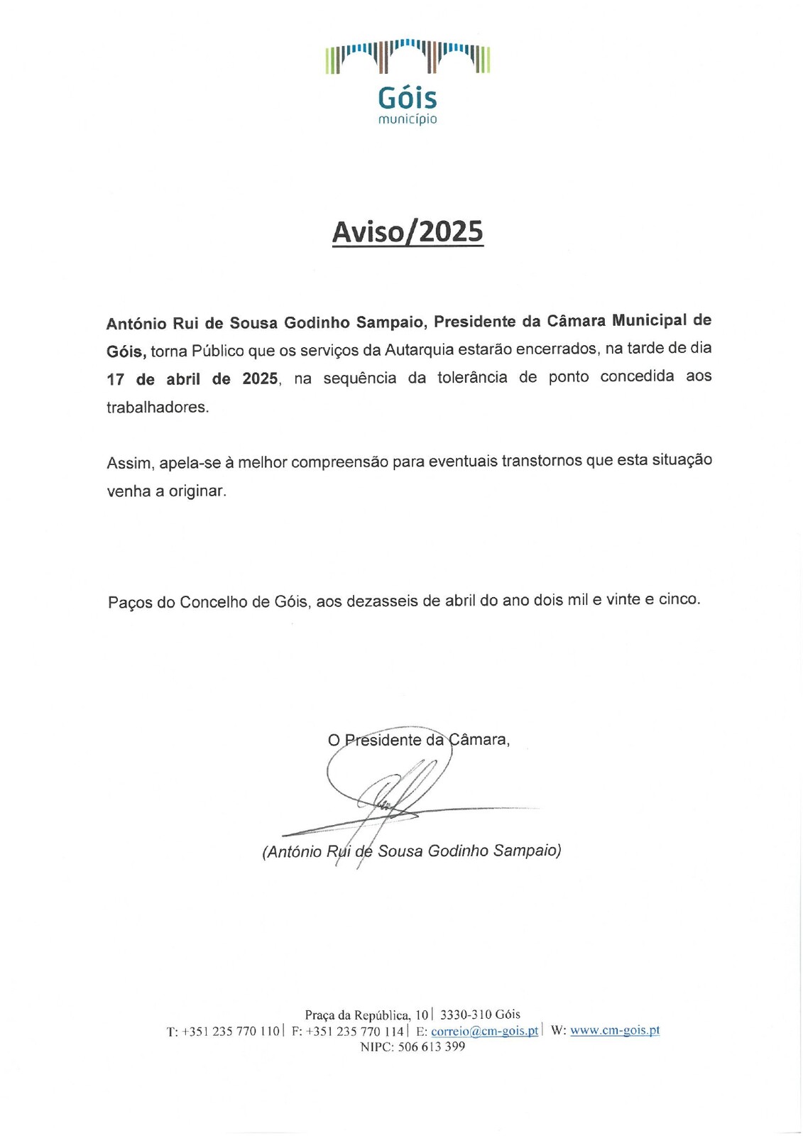 António Rui de Sousa Godinho Sampaio, Presidente da Câmara Municipal de Góis, torna público que os serviços da Autarquia estarão encerrados, 𝐧𝐚 𝐭𝐚𝐫𝐝𝐞 𝐝𝐞 𝐝𝐢𝐚 𝟏𝟕 𝐝𝐞 𝐚𝐛𝐫𝐢𝐥 𝐝𝐞 𝟐𝟎𝟐𝟓, na sequência da 𝐭𝐨𝐥𝐞𝐫â𝐧𝐜𝐢𝐚 𝐝𝐞 𝐩𝐨𝐧𝐭𝐨 concedida aos trabalhadores.