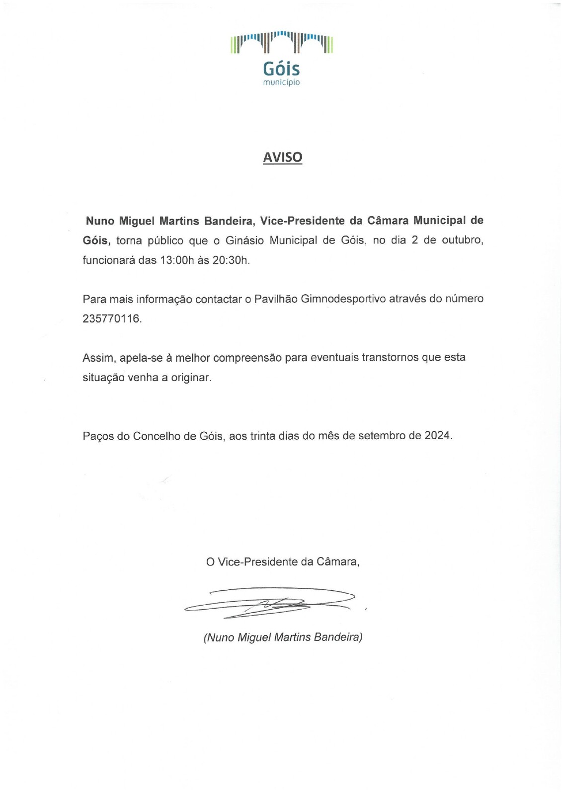 Nuno Miguel Martins Bandeira, Vice-Presidente da Câmara Municipal de Góis, torna público que o Ginásio Municipal de Góis, no dia 2 de Outubro, funcionará das 13h00 às 20h30.