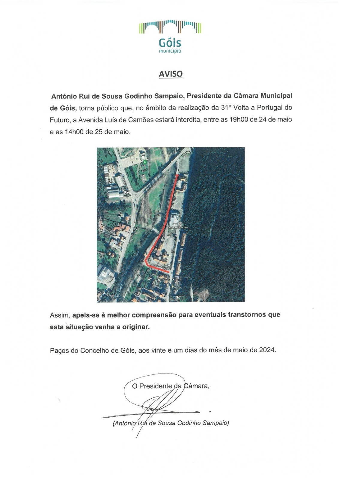 António Rui de Sousa Godinho Sampaio, Presidente da Câmara Municipal de Góis, tona público que, no âmbito da realização da 31º Volta a Portugal do Futuro, a Avenida Luís de Camões estará interdita, entre as 19:00h do dia 24 de maio e as 14:00h do dia 25 de maio.