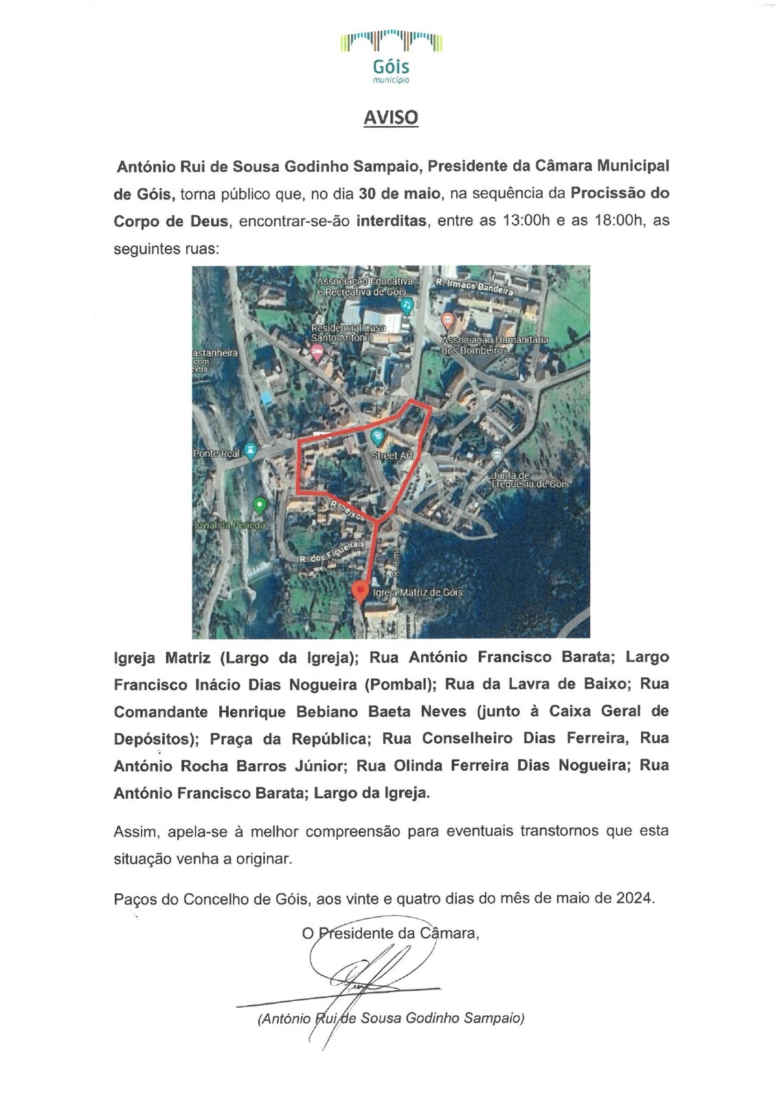 António Rui de Sousa Godinho Sampaio, Presidente da Câmara Municipal de Góis, torna público que, no dia 30 de maio, na sequência da Procissão do Corpo de Deus, encontrar-se-ão interditas, entre as 13:00h e as 18:00h, as seguintes ruas: