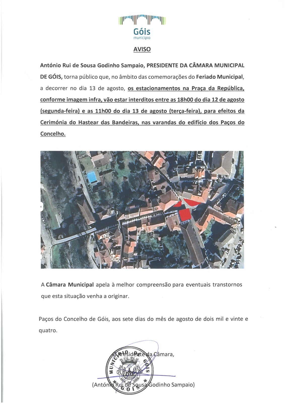 António Rui de Sousa Godinho Sampaio, Presidente da Câmara Municipal de Góis, torna público que, no âmbito das comemorações do Feriado Municipal, a decorrer no dia 13 de agosto, os estacionamentos na Praça da República, conforme imagem infra, vão estar interditos entre as 18h00 do dia 12 de agosto (segunda-feira) e as 11h00 do dia 13 de agosto (terça-feira), para efeitos da Cerimónia do Hastear das Bandeiras, nas varandas do edifício dos Paços do Concelho.