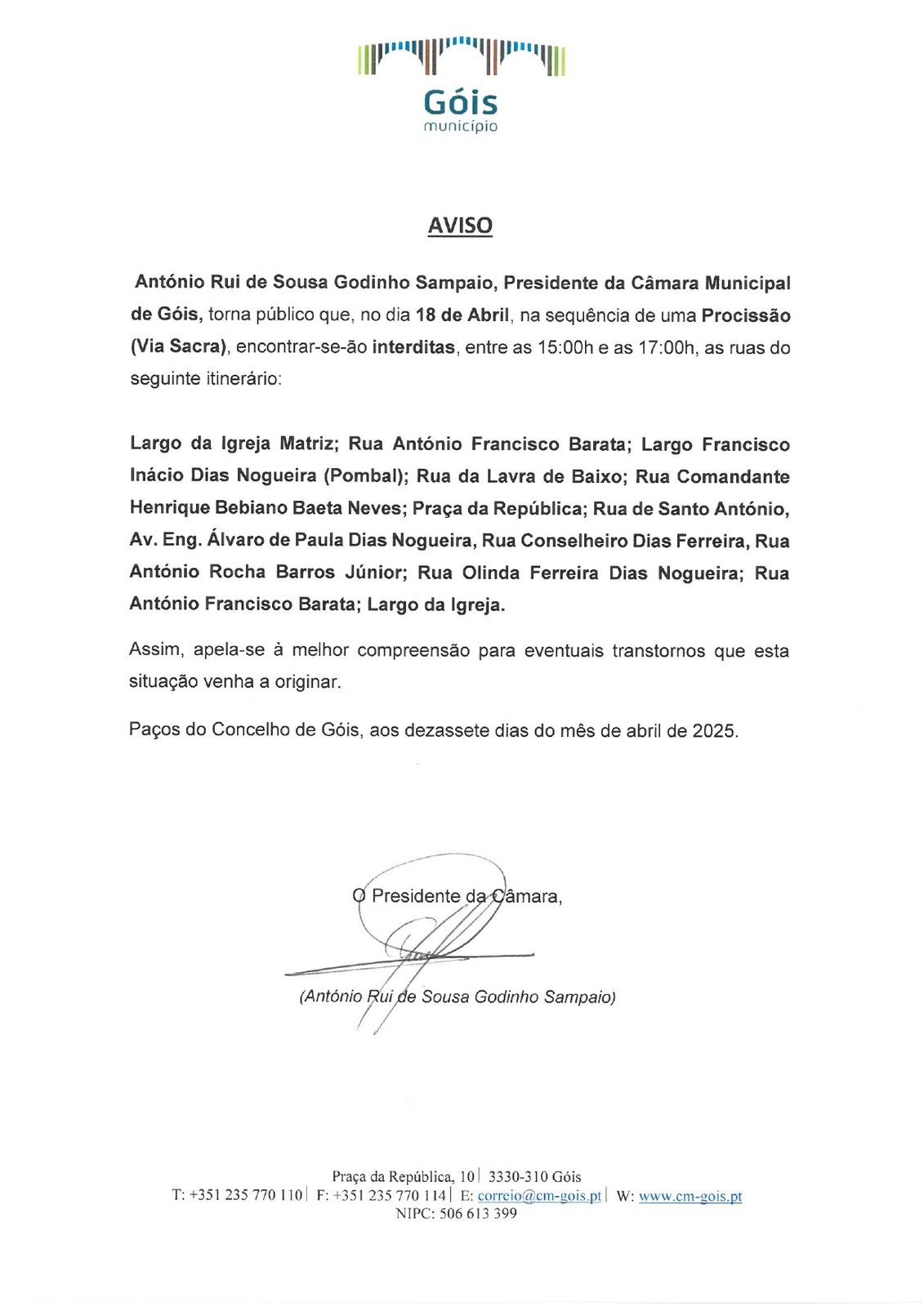 António Rui de Sousa Godinho Sampaio, Presidente da Câmara Municipal de Góis, torna público que, no dia 𝟏𝟖 𝐝𝐞 𝐚𝐛𝐫𝐢𝐥, na sequência de uma 𝐏𝐫𝐨𝐜𝐢𝐬𝐬ã𝐨 (𝐕𝐢𝐚 𝐒𝐚𝐜𝐫𝐚), encontrar-se-ão interditas, entre as 𝟏𝟓𝐡𝟎𝟎 𝐞 𝐚𝐬 𝟏𝟕𝐡𝟎𝟎, as ruas mencionadas na imagem.