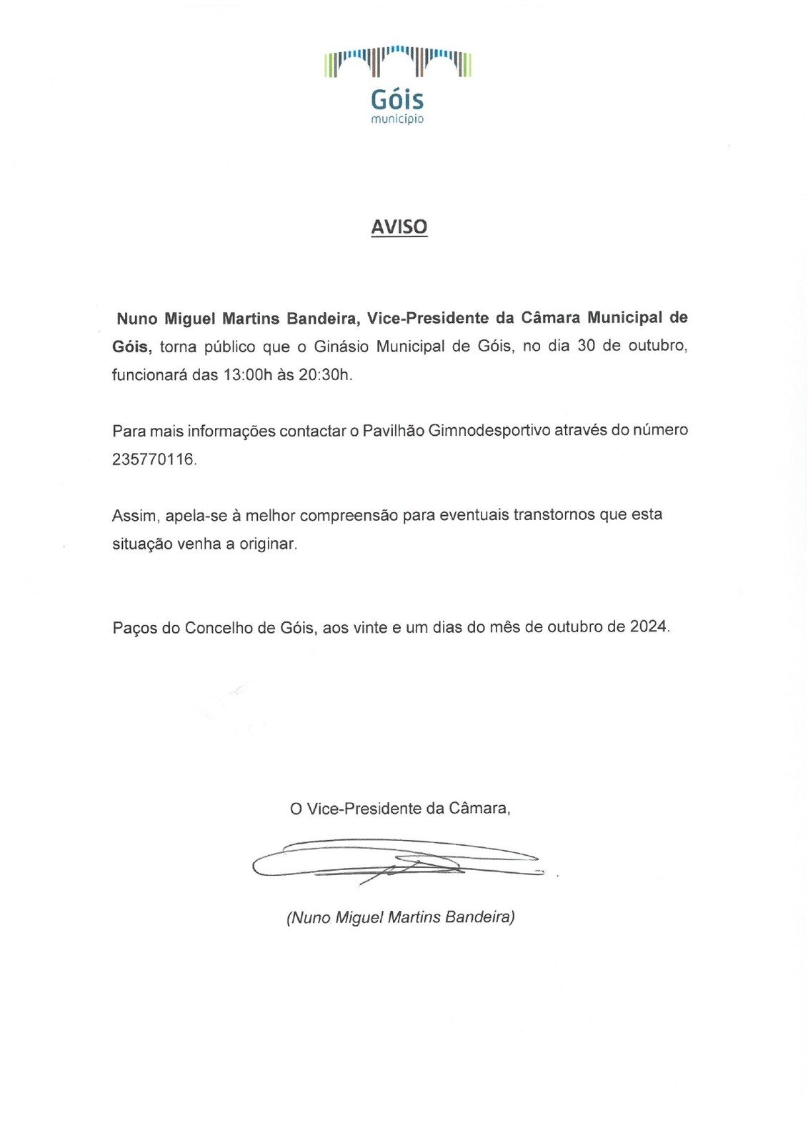 Nuno Miguel Martins Bandeira, Vice-Presidente da Câmara Municipal de Góis, torna público que o Ginásio Municipal de Góis, no dia 30 de outubro, funcionará das 13h00 às 20h30.