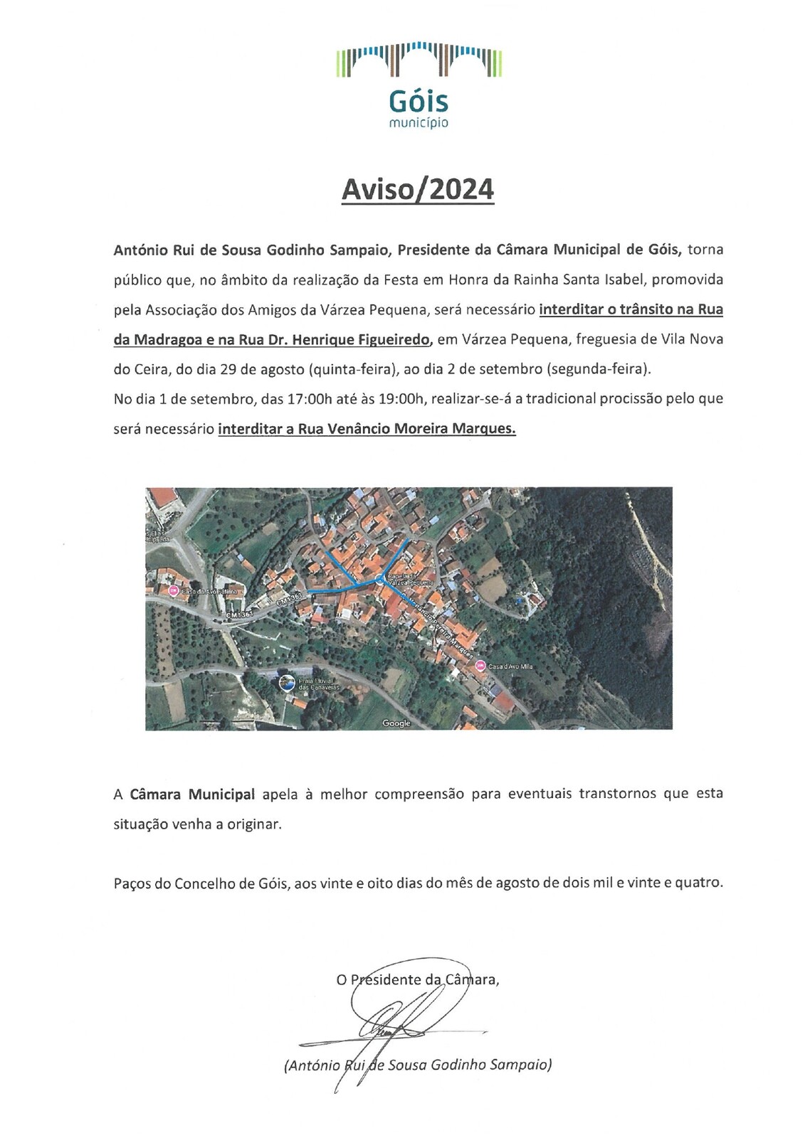 António Rui de Sousa Godinho Sampaio, Presidente da Câmara Municipal de Góis, torna público que, no âmbito da realização da Festas em Honra da Rainha Santa Isabel, promovida pela Associação dos Amigos da Várzea Pequena, será necessário 𝐢𝐧𝐭𝐞𝐫𝐝𝐢𝐭𝐚𝐫 𝐨 𝐭𝐫â𝐧𝐬𝐢𝐭𝐨 𝐧𝐚 𝐑𝐮𝐚 𝐝𝐚 𝐌𝐚𝐝𝐫𝐚𝐠𝐨𝐚 𝐞 𝐧𝐚 𝐑𝐮𝐚 𝐃𝐫. 𝐇𝐞𝐧𝐫𝐢𝐪𝐮𝐞 𝐅𝐢𝐠𝐮𝐞𝐢𝐫𝐞𝐝𝐨, em Várzea Pequena, freguesia de Vila Nova do Ceira, do dia 29 de agosto (quinta-feira), ao dia 2 de setembro (segunda-feira).