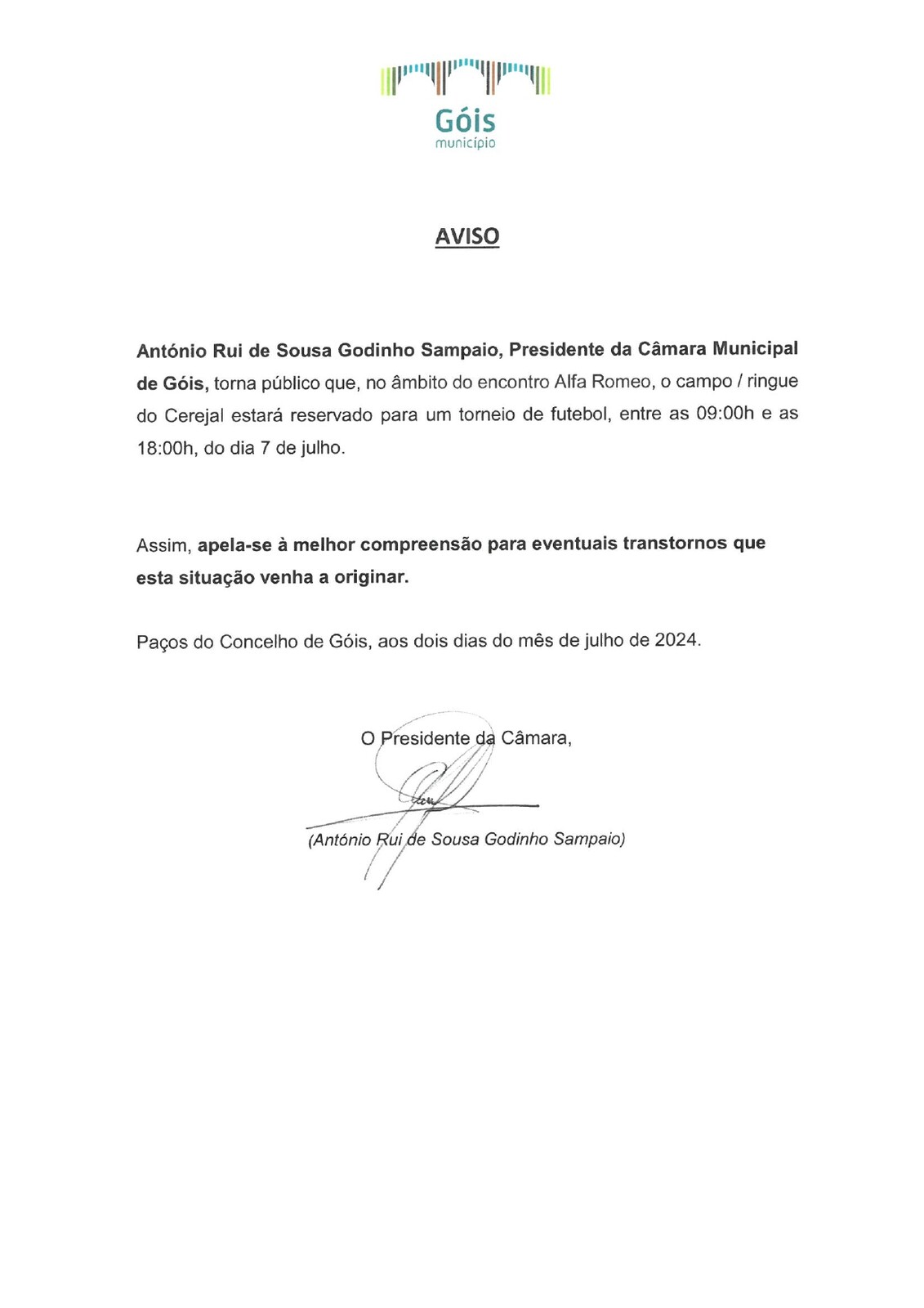 António Rui de Sousa Godinho Sampaio, Presidente da Câmara Municipal de Góis, torna público que, no âmbito do encontro Alfa Romeo, o campo / ringue do Cerejal estará reservado para um torneio de futebol, entre as 09h00 e as 18h00, do dia 7 de julho.