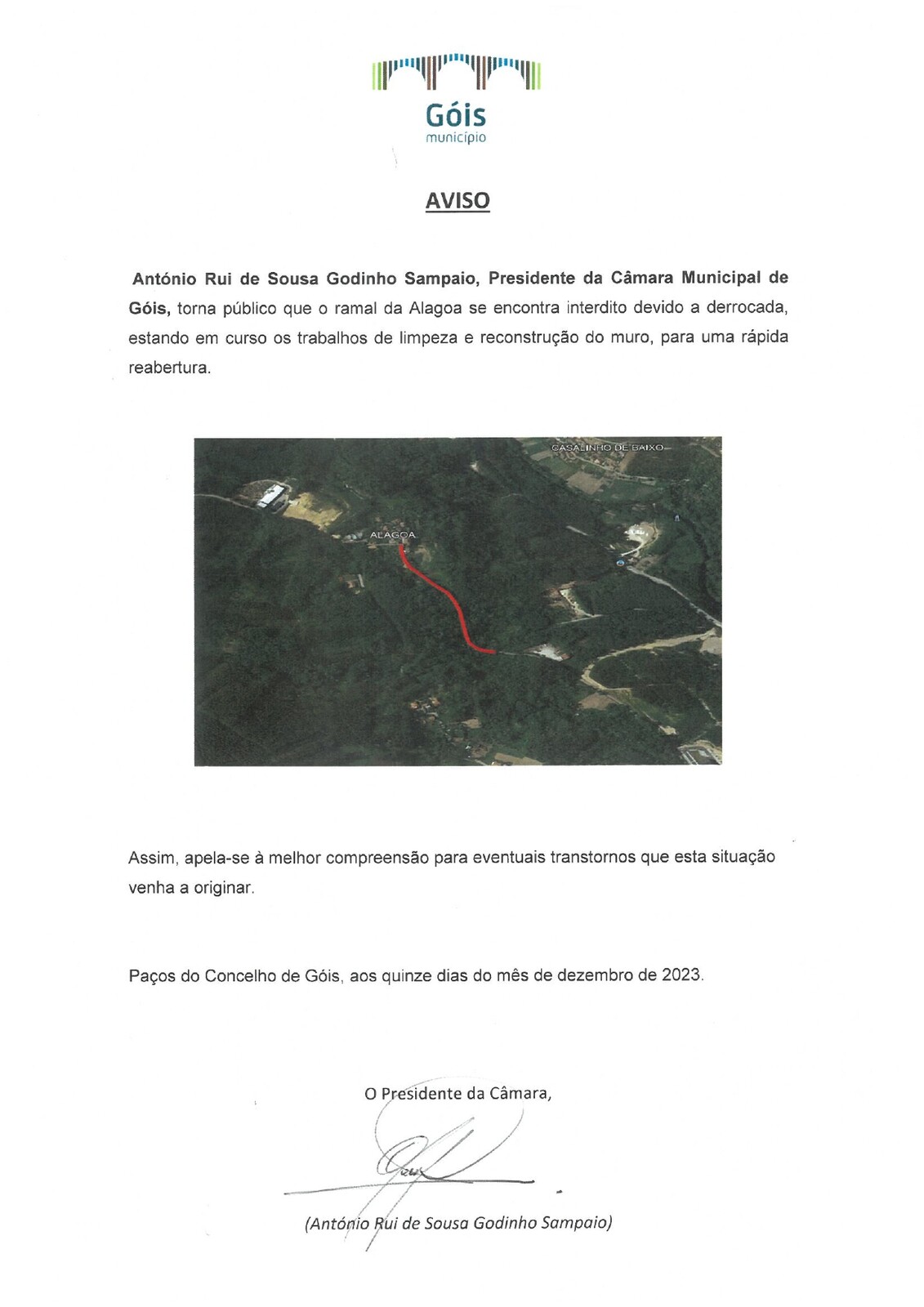 António Rui de Sousa Godinho Sampaio, Presidente da Câmara Municipal de Góis, torna público que o ramal da Alagoa se encontra interdito devido a derrocada, estando em curso os trabalhos de limpeza e reconstrução do muro, para uma rápida reabertura.