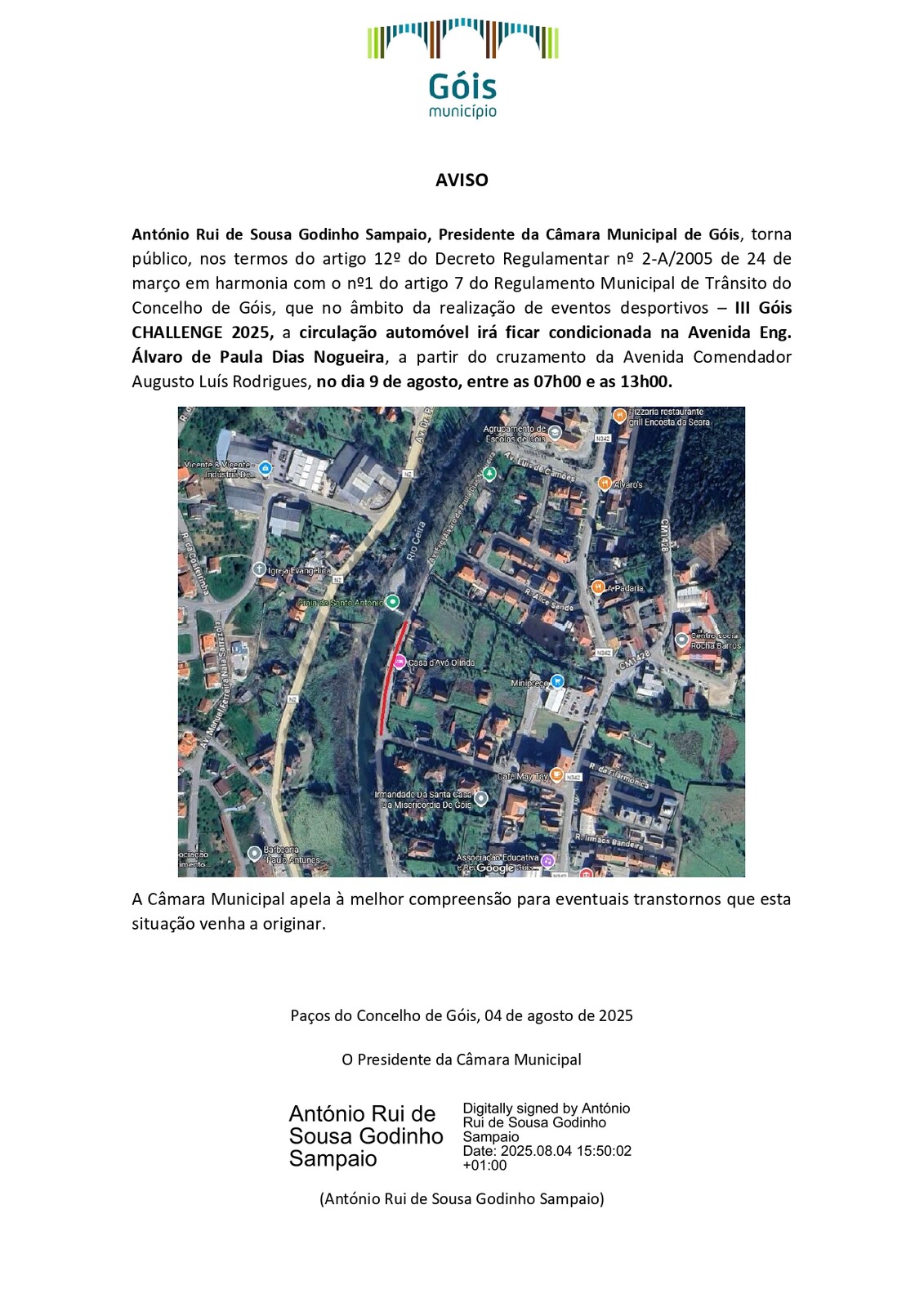No âmbito da realização do 𝐈𝐈𝐈 𝐆ó𝐢𝐬 𝐂𝐇𝐀𝐋𝐋𝐄𝐍𝐆𝐄 𝟐𝟎𝟐𝟓, 𝐚 𝐜𝐢𝐫𝐜𝐮𝐥𝐚çã𝐨 𝐚𝐮𝐭𝐨𝐦ó𝐯𝐞𝐥 𝐢𝐫á 𝐟𝐢𝐜𝐚𝐫 𝐜𝐨𝐧𝐝𝐢𝐜𝐢𝐨𝐧𝐚𝐝𝐚 𝐧𝐚 𝐀𝐯𝐞𝐧𝐢𝐝𝐚 𝐄𝐧𝐠. Á𝐥𝐯𝐚𝐫𝐨 𝐝𝐞 𝐏𝐚𝐮𝐥𝐚 𝐃𝐢𝐚𝐬 𝐍𝐨𝐠𝐮𝐞𝐢𝐫𝐚, a partir do cruzamento da Avenida Comendador Augusto Luís Rodrigues, 𝐧𝐨 𝐝𝐢𝐚 𝟗 𝐝𝐞 𝐚𝐠𝐨𝐬𝐭𝐨, 𝐞𝐧𝐭𝐫𝐞 𝐚𝐬 𝟎𝟕𝐡𝟎𝟎 𝐞 𝐚𝐬 𝟏𝟑𝐡𝟎𝟎.