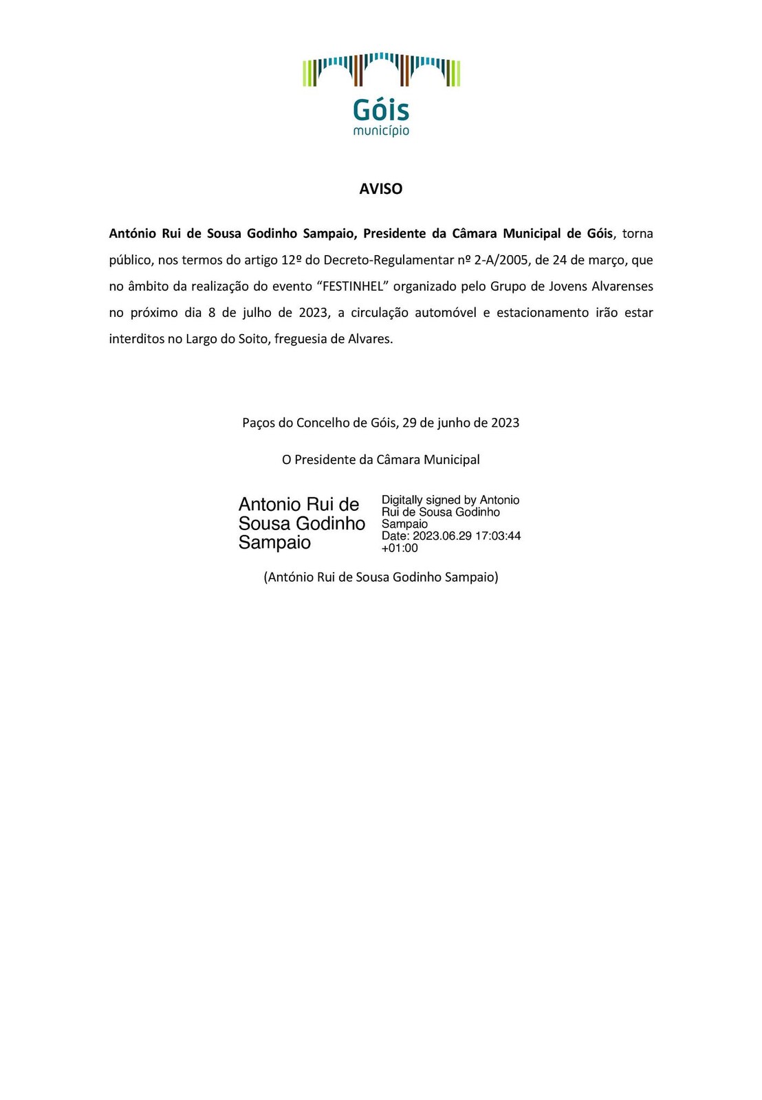 No âmbito da realização do evento “FESTINHEL” organizado pelo Grupo de Jovens Alvarenses no próximo dia 8 de julho de 2023, a circulação automóvel e estacionamento irão estar interditos no Largo do Soito, freguesia de Alvares.