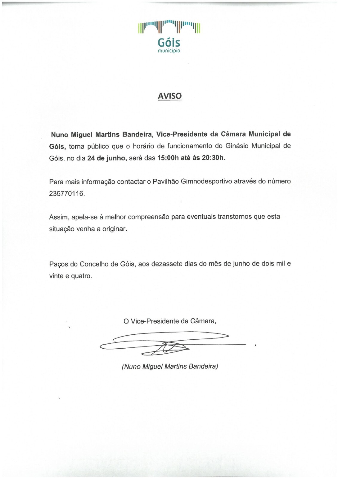 Nuno Miguel Martins Bandeira, Vice-Presidente da Câmara Municipal de Góis, torna público que o horário de funcionamento do Ginásio Municipal de Góis, no dia 24 de junho, será das 15h00 até às 20h30.