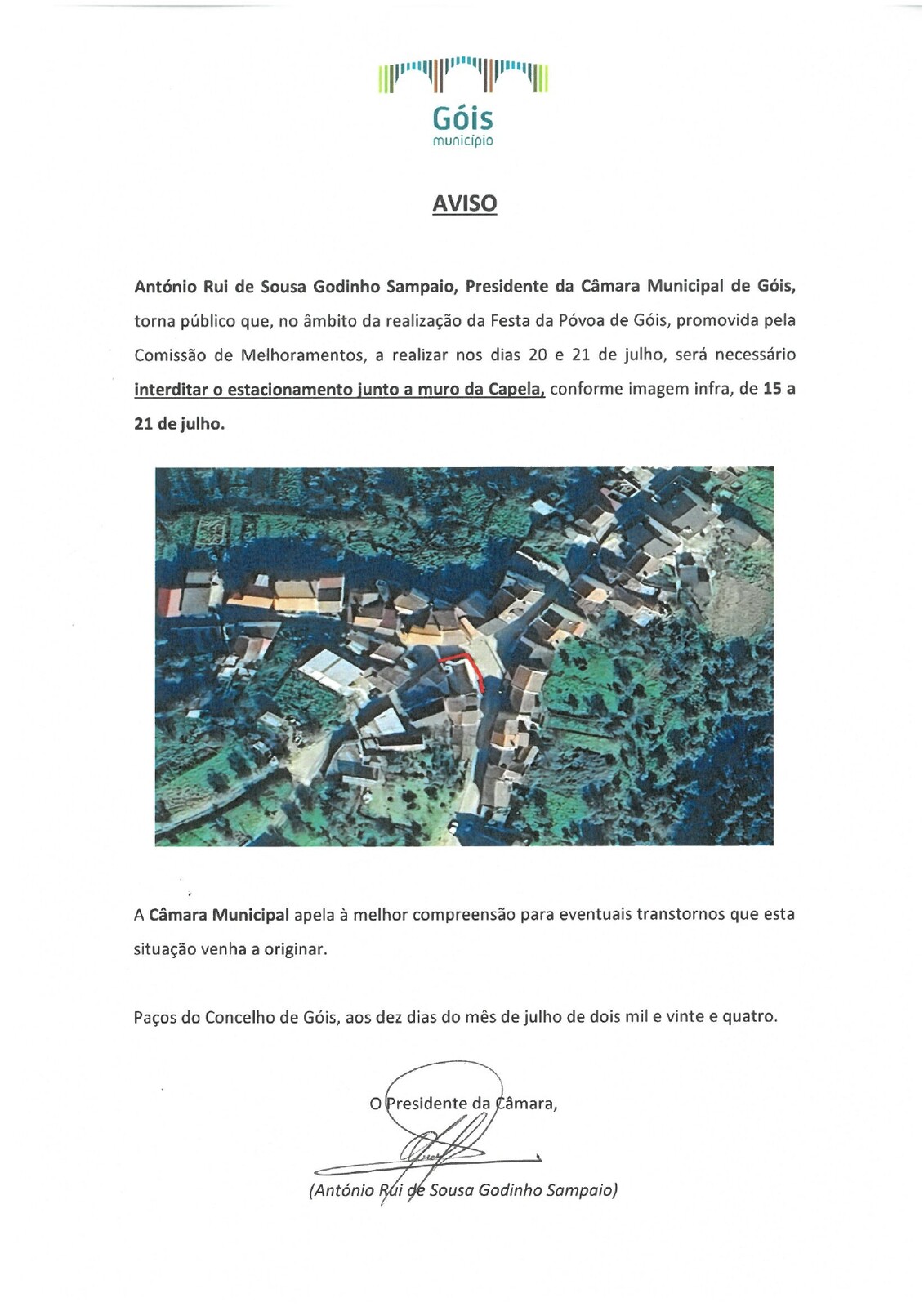 António Rui de Sousa Godinho Sampaio, Presidente da Câmara Municipal de Góis, torna público que, no âmbito da realização da Festa da Póvoa de Góis, promovida pela Comissão de Melhoramentos, a realizar nos dias 20 e 21 de julho, será necessário interditar o estacionamento junto ao muro da Capela, conforme imagem infra, de 15 a 21 de julho.
