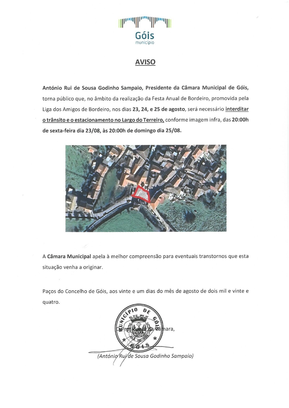 António Rui de Sousa Godinho Sampaio, Presidente da Câmara Municipal de Góis, torna público que, no âmbito da realização da Festa Anual de Bordeiro, promovida pela Liga dos Amigos de Bordeiro, nos dias 23, 24 e 25 de agosto, será necessário interditar o trânsito e o estacionamento no Largo do Terreiro, das 20h00 de sexta-feira dia 23/08, às 20h00 de domingo dia 25/08.