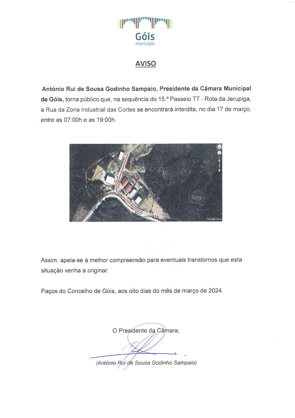 António Rui de Sousa Godinho Sampaio, Presidente da Câmara Municipal de Góis, torna público que, na sequência do 15º Passeio TT - Rota da Jerupiga, a Rua da Zona Industrial das Cortes se encontrará interdita, no dia 17 de março, entre as 07h00 e as 19h00.