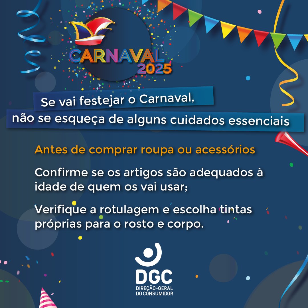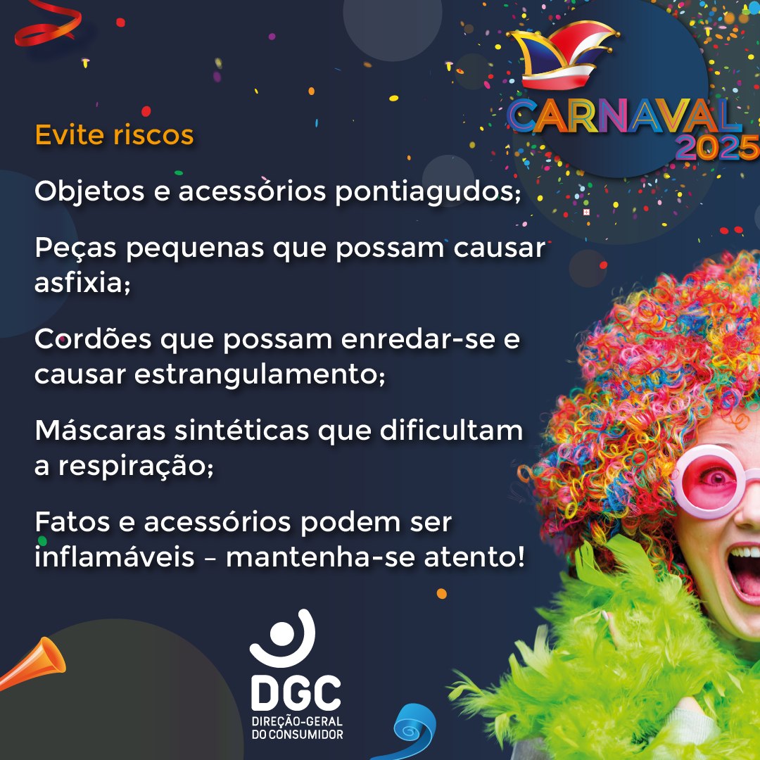 O Carnaval é sinónimo de folia, mas é importante adotar alguns cuidados para que a festa decorra em segurança. Para ajudar os consumidores a fazer escolhas mais seguras, a Direção-Geral do Consumidor divulgou uma campanha com alguns conselhos sobre a compra e utilização de fatos, máscaras e acessórios.