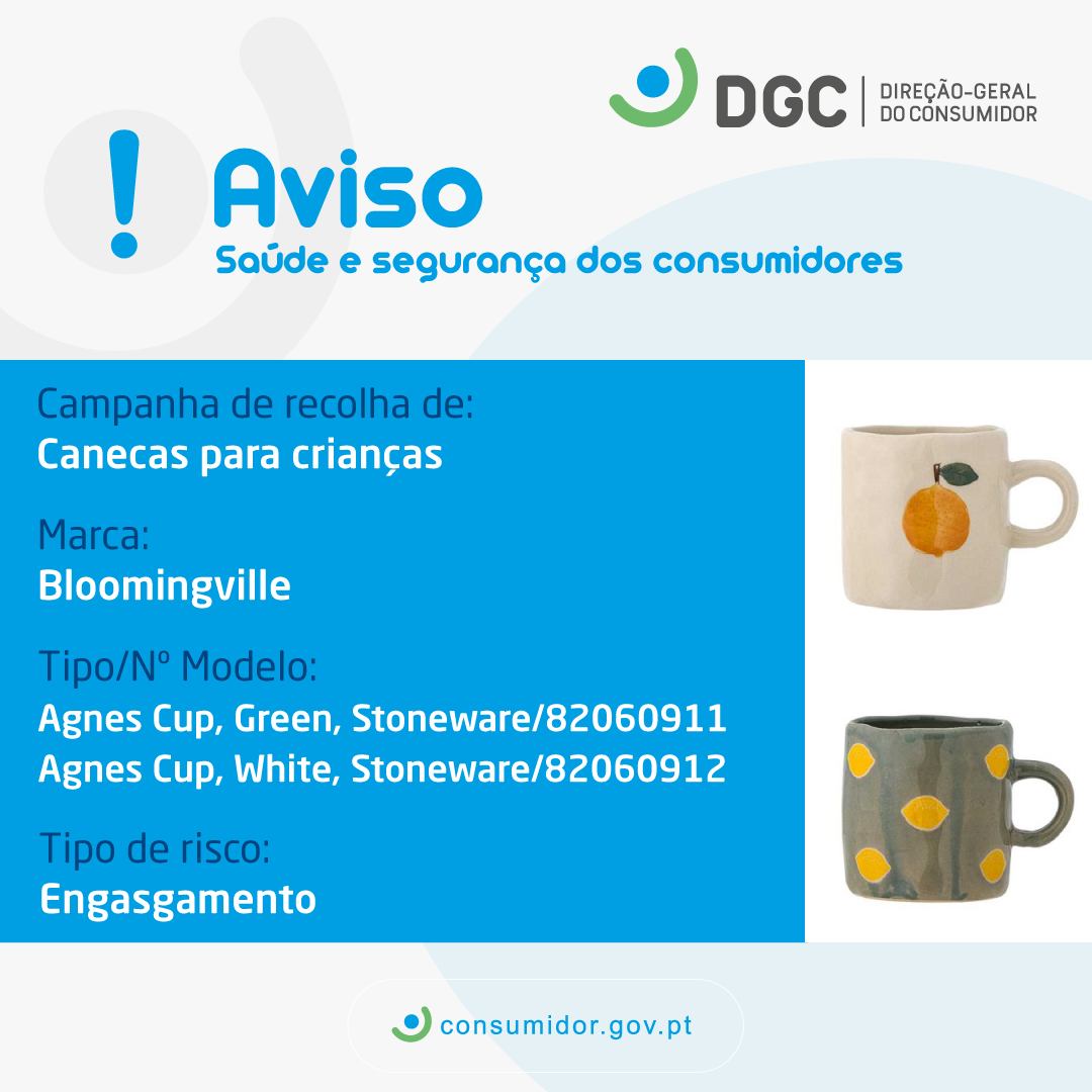 O Município de Góis, no âmbito da missão do Centro de Informação Autárquico ao Consumidor – CIAC, partilha o aviso da Direção-Geral do Consumidor quanto à campanha de Canecas para crianças, da marca Bloomingville, com tipo de risco Engasgamento para o consumidor.