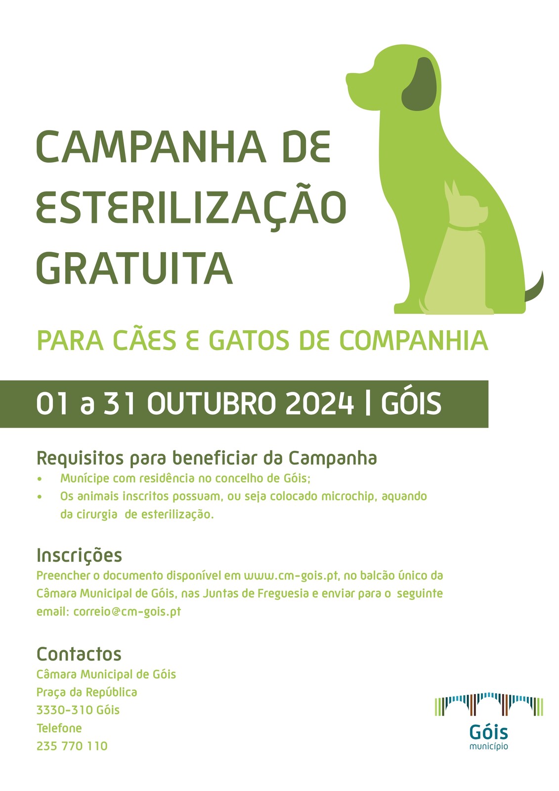 A Câmara Municipal de Góis, seguindo as recomendações da Lei n.º 27/2016, de 23 de Agosto, que privilegia a esterilização como forma de controlo da população de animais errantes, promove uma nova Campanha de Esterilização gratuita de animais de companhia, que irá decorrer de 01 a 31 de Outubro de 2024, sendo as intervenções cirúrgicas efetuadas em Centro de Atendimento Médico-Veterinário da região.