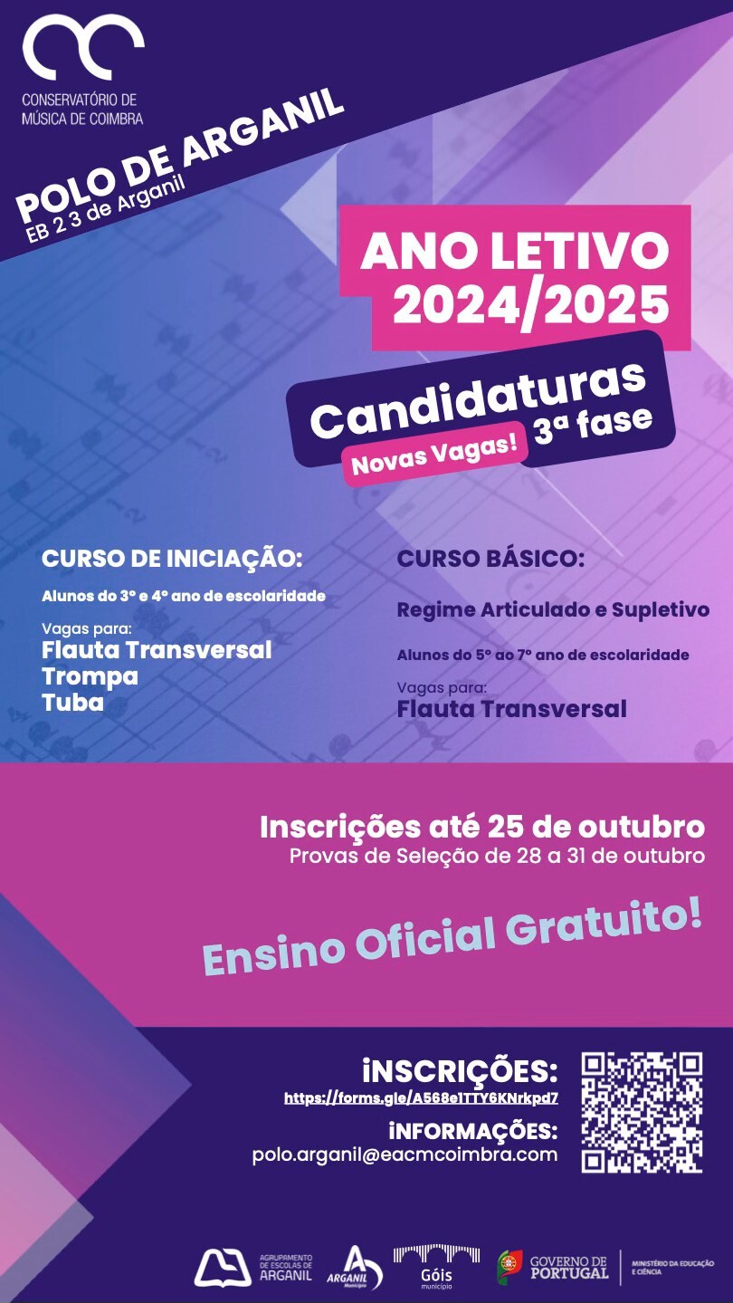 Está aberta a 3ª fase de candidaturas para a frequência do Ensino Artístico Especializado no Polo Educativo de Arganil da Escola Artística do Conservatório de Música de Coimbra.