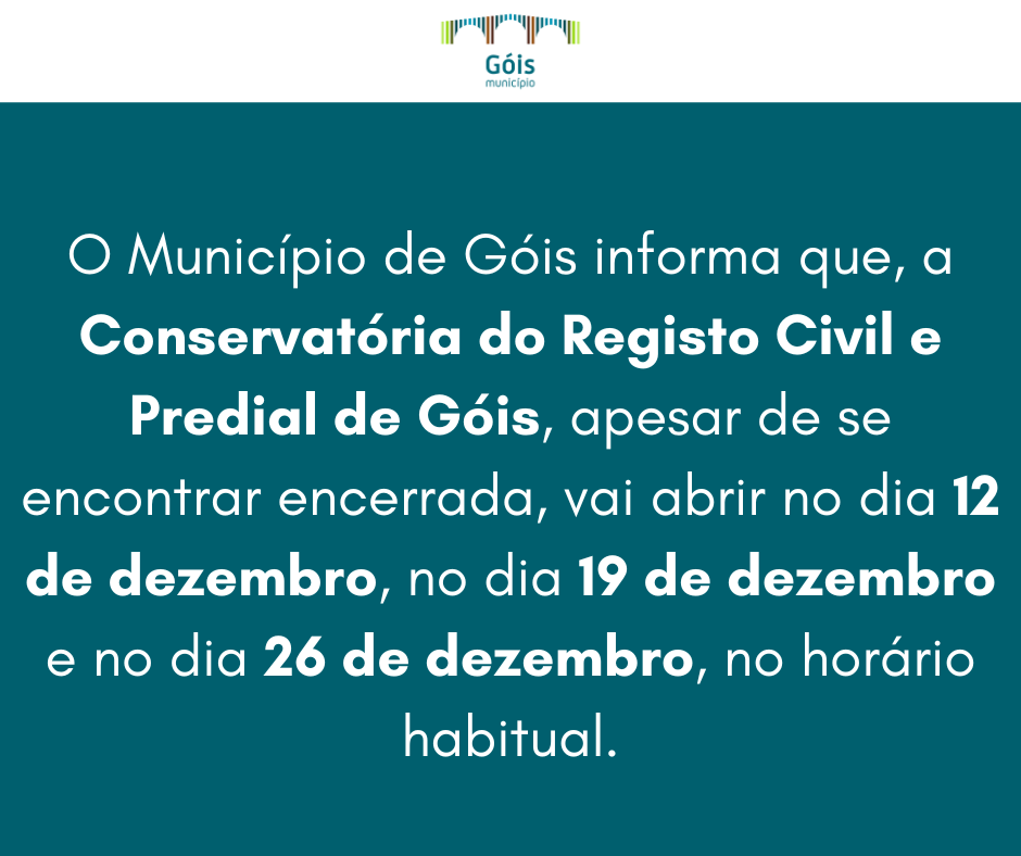 O Município de Góis informa que, a 𝐂𝐨𝐧𝐬𝐞𝐫𝐯𝐚𝐭ó𝐫𝐢𝐚 𝐝𝐨 𝐑𝐞𝐠𝐢𝐬𝐭𝐨 𝐂𝐢𝐯𝐢𝐥 𝐞 𝐏𝐫𝐞𝐝𝐢𝐚𝐥 𝐝𝐞 𝐆ó𝐢𝐬, apesar de se encontrar encerrada, vai abrir no dia 𝟏𝟐 𝐝𝐞 𝐝𝐞𝐳𝐞𝐦𝐛𝐫𝐨, no dia 𝟏𝟗 𝐝𝐞 𝐝𝐞𝐳𝐞𝐦𝐛𝐫𝐨 e no dia 𝟐𝟔 𝐝𝐞 𝐝𝐞𝐳𝐞𝐦𝐛𝐫𝐨, no horário habitual.