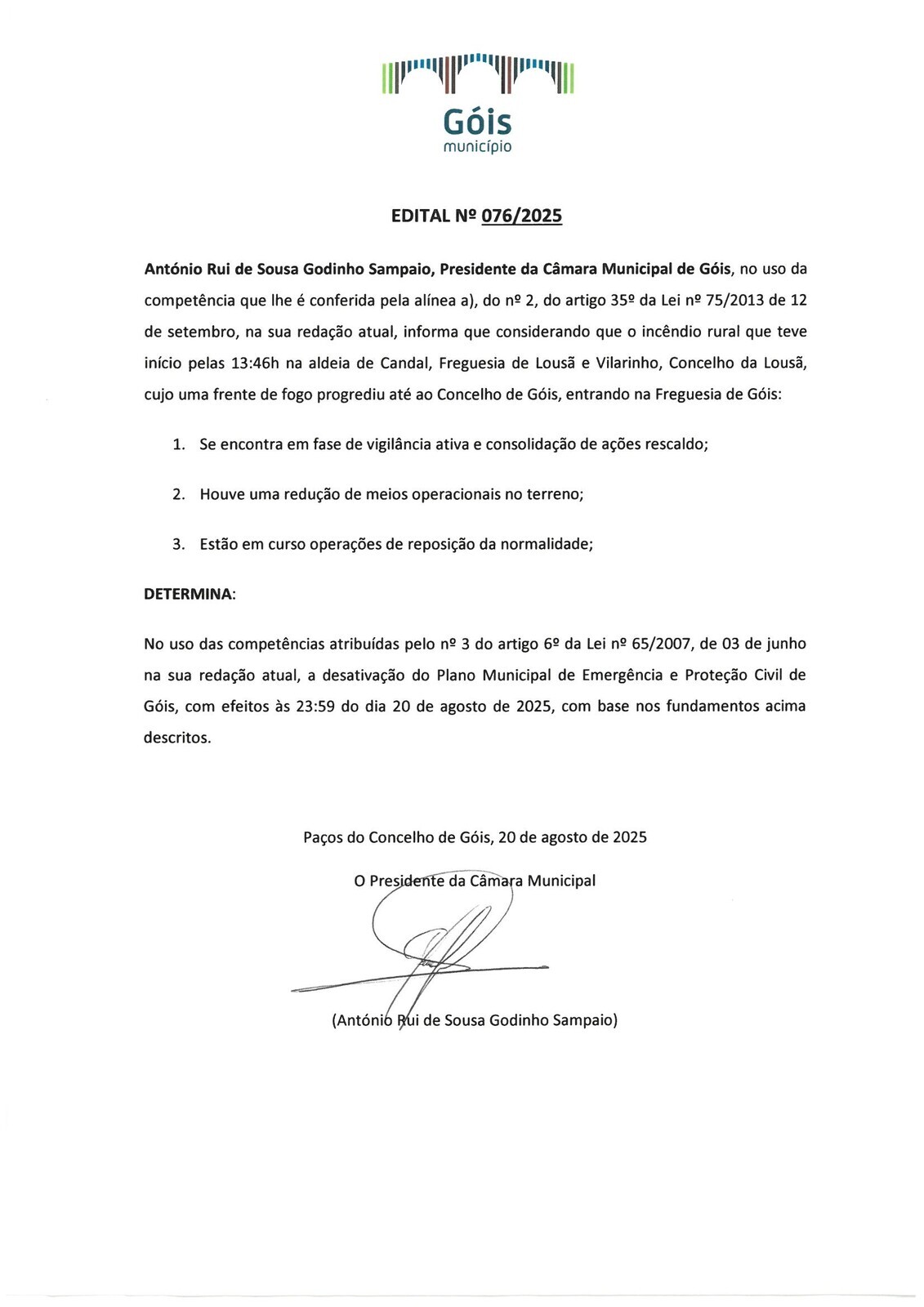 A desativação do Plano Municipal de Emergência e Proteção Civil de Góis, com efeitos às 23:59h do dia 20 de agosto de 2025, com base nos fundamentos acima descritos.