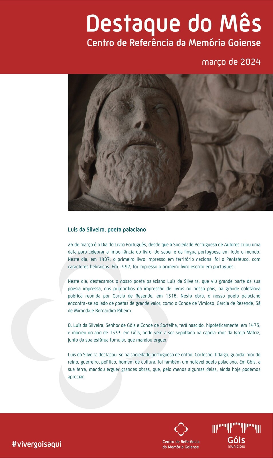 Neste dia, destacamos o nosso poeta palaciano Luís da Silveira, que viu grande parte da sua poesia impressa, nos primórdios da impressão de livros no nosso país, na grande coletânea poética reunida por Garcia de Resende, em 1516. Nesta obra, o nosso poeta palaciano encontra-se ao lado de poetas de grande valor, como o Conde de Vimioso, Garcia de Resende, Sá de Miranda e Bernardim Ribeiro.