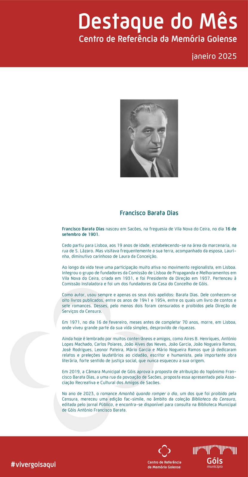 𝐅𝐫𝐚𝐧𝐜𝐢𝐬𝐜𝐨 𝐁𝐚𝐫𝐚𝐭𝐚 𝐃𝐢𝐚𝐬 nasceu em Sacões, na freguesia de Vila Nova do Ceira, no dia 𝟏𝟔 𝐝𝐞 𝐬𝐞𝐭𝐞𝐦𝐛𝐫𝐨 𝐝𝐞 𝟏𝟗𝟎𝟏.
