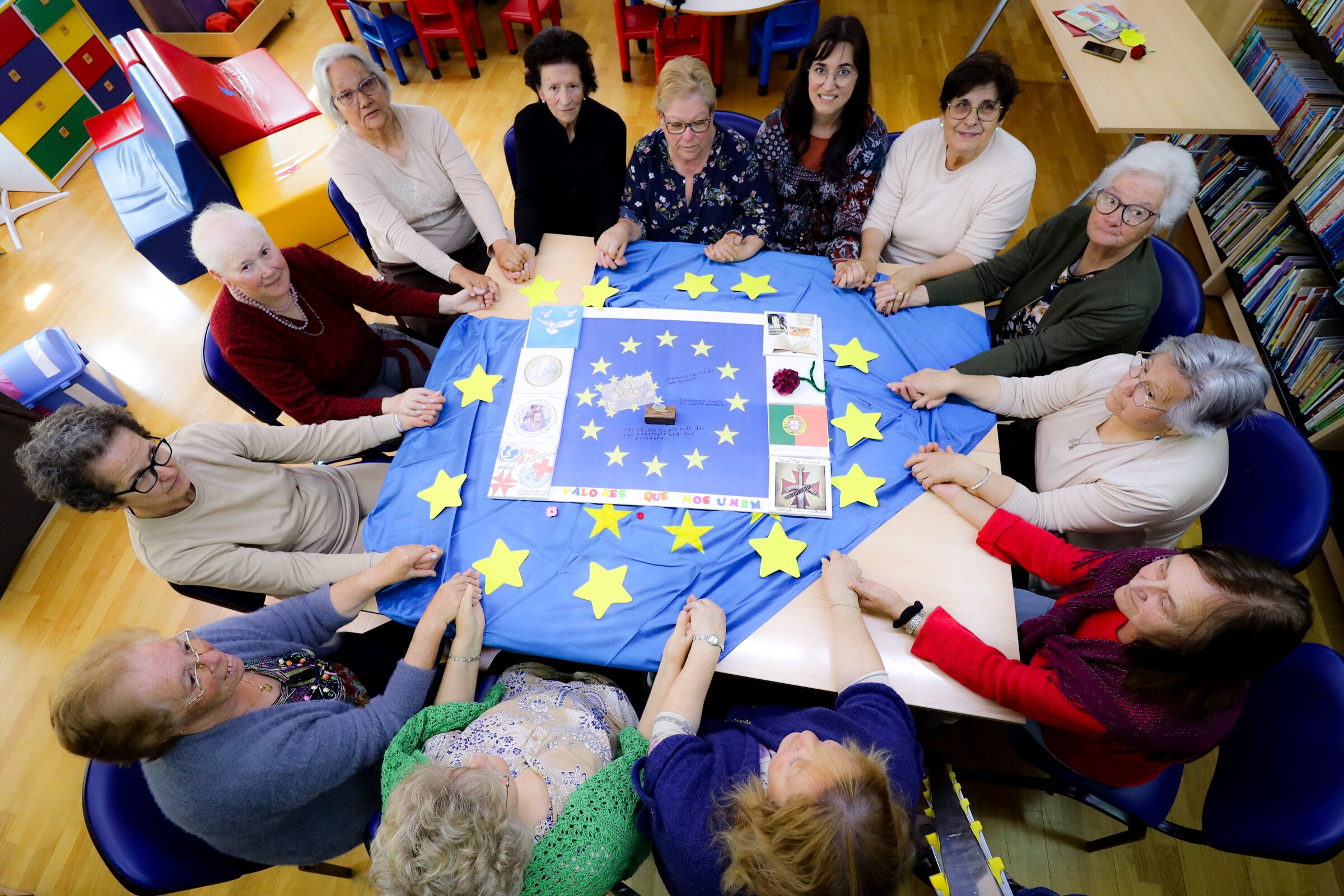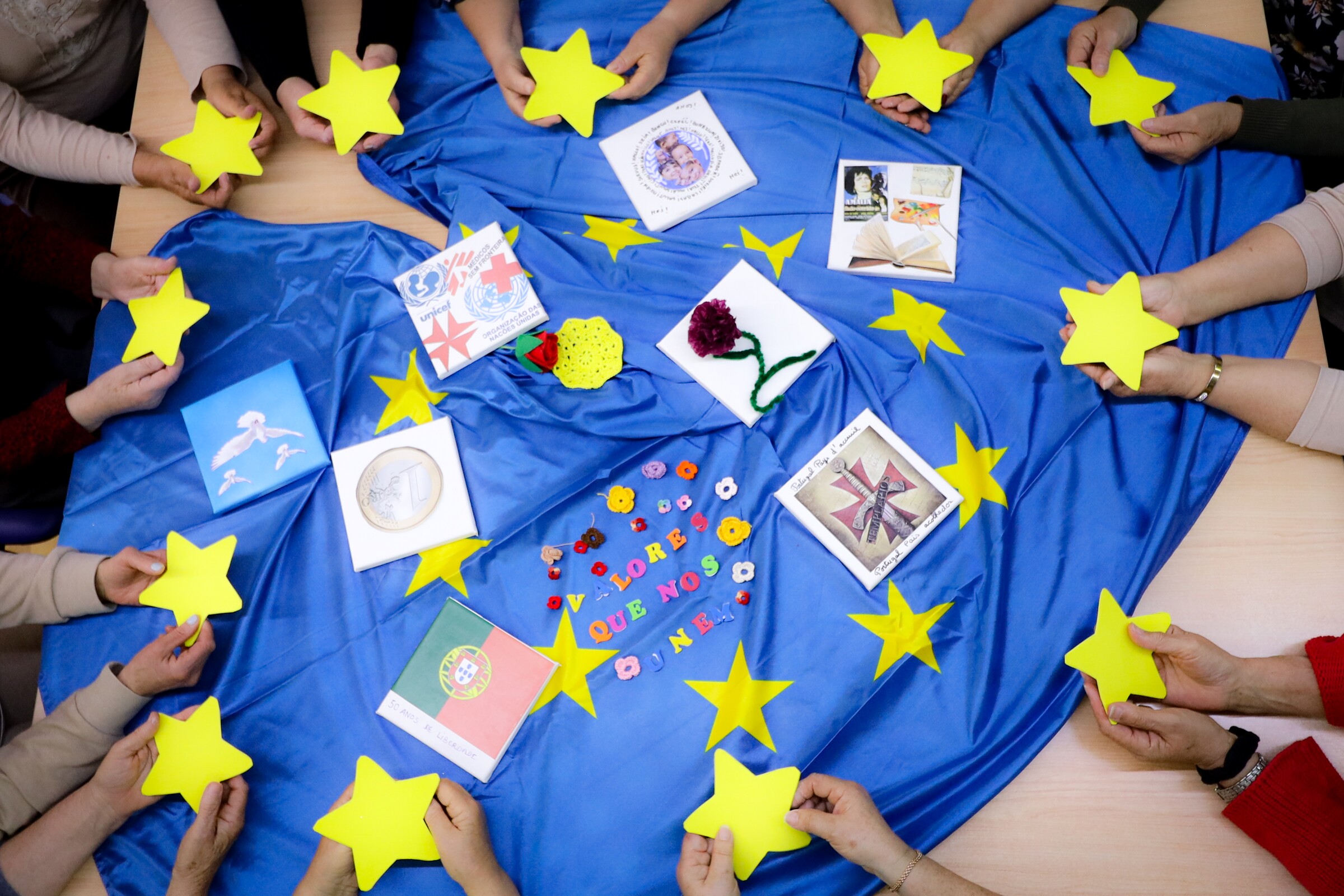 A artesã Amélia Neves, com as suas academias, elaborou ainda um outro cenário, com a Bandeira da União Europeia, e algumas telas pintadas alusivas ao tema.