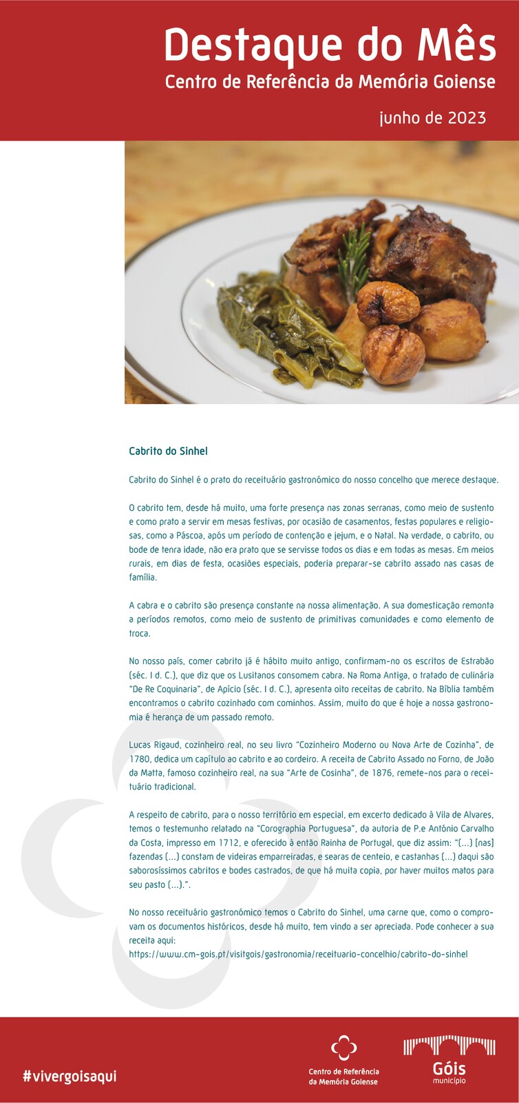 No nosso receituário gastronómico temos o Cabrito do Sinhel, uma carne que, como o comprovam os documentos históricos, desde há muito, tem vindo a ser apreciada. Pode conhecer a sua receita aqui: https://www.cm-gois.pt/.../receituario.../cabrito-do-sinhel