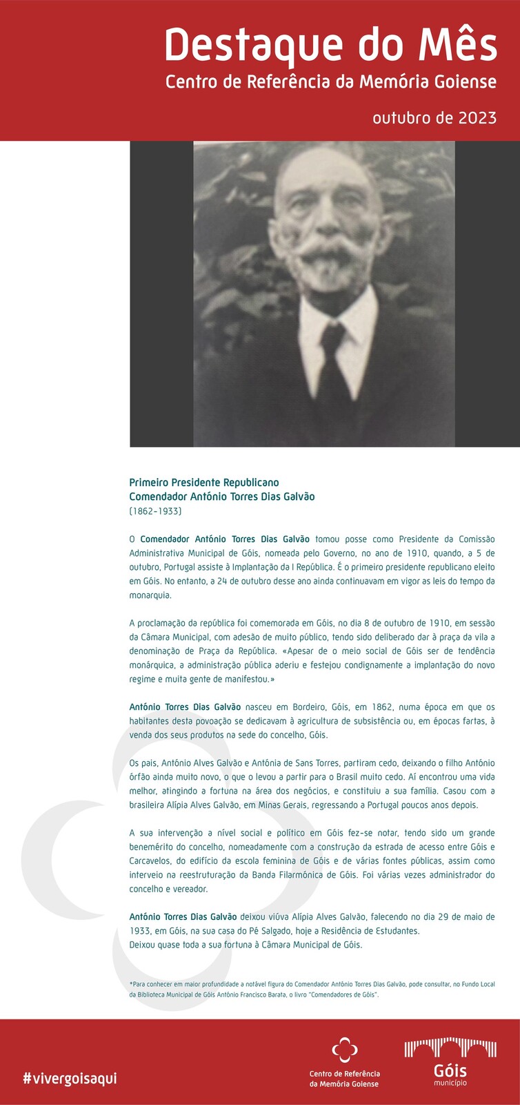 ✅ O Comendador António Torres Dias Galvão tomou posse como Presidente da Comissão Administrativa Municipal de Góis, nomeada pelo Governo, no ano de 1910, quando, a 5 de outubro, Portugal assiste à Implantação da I República. É o primeiro presidente republicano eleito em Góis. No entanto, a 24 de outubro desse ano ainda continuavam em vigor as leis do tempo da monarquia.