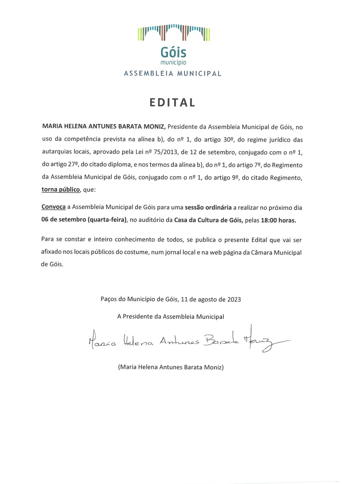 Convoca a Assembleia Municipal de Góis para uma sessão ordinária a realizar no próximo dia 6 de setembro (quarta-feira), no auditório da Casa da Cultura de Góis, pelas 18h00 horas.