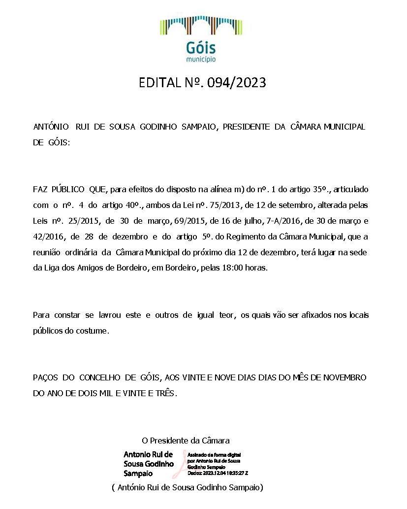 Reunião ordinária da Câmara Municipal do próximo dia 12 de dezembro, terá lugar na sede da Liga dos Amigos de Bordeiro, pelas 18:00 horas.
