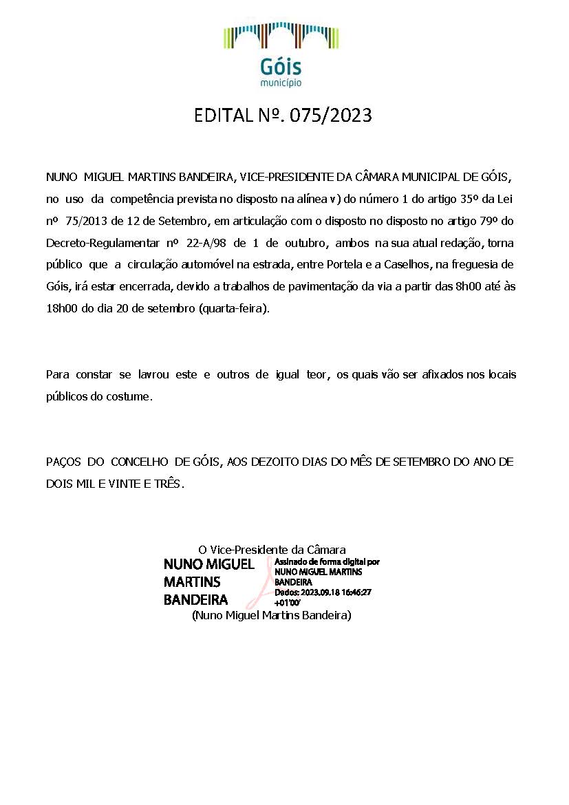 NUNO MIGUEL MARTINS BANDEIRA, VICE-PRESIDENTE DA CÂMARA MUNICIPAL DE GÓIS, no uso da competência prevista no disposto na alínea v) do número 1 do artigo 35º da Lei no 75/2013 de 12 de Setembro, em articulação com o disposto no disposto no artigo 79º do Decreto-Regulamentar no 22-A/98 de 1 de outubro, ambos na sua atual redação, torna público que a circulação automóvel na estrada, entre Portela e a Caselhos, na Freguesia de Góis irá estar encerrada, devido a trabalhos de pavimentação da via a partir das 8h00 até às 18h00 do dia 20 de setembro (quarta-feira).