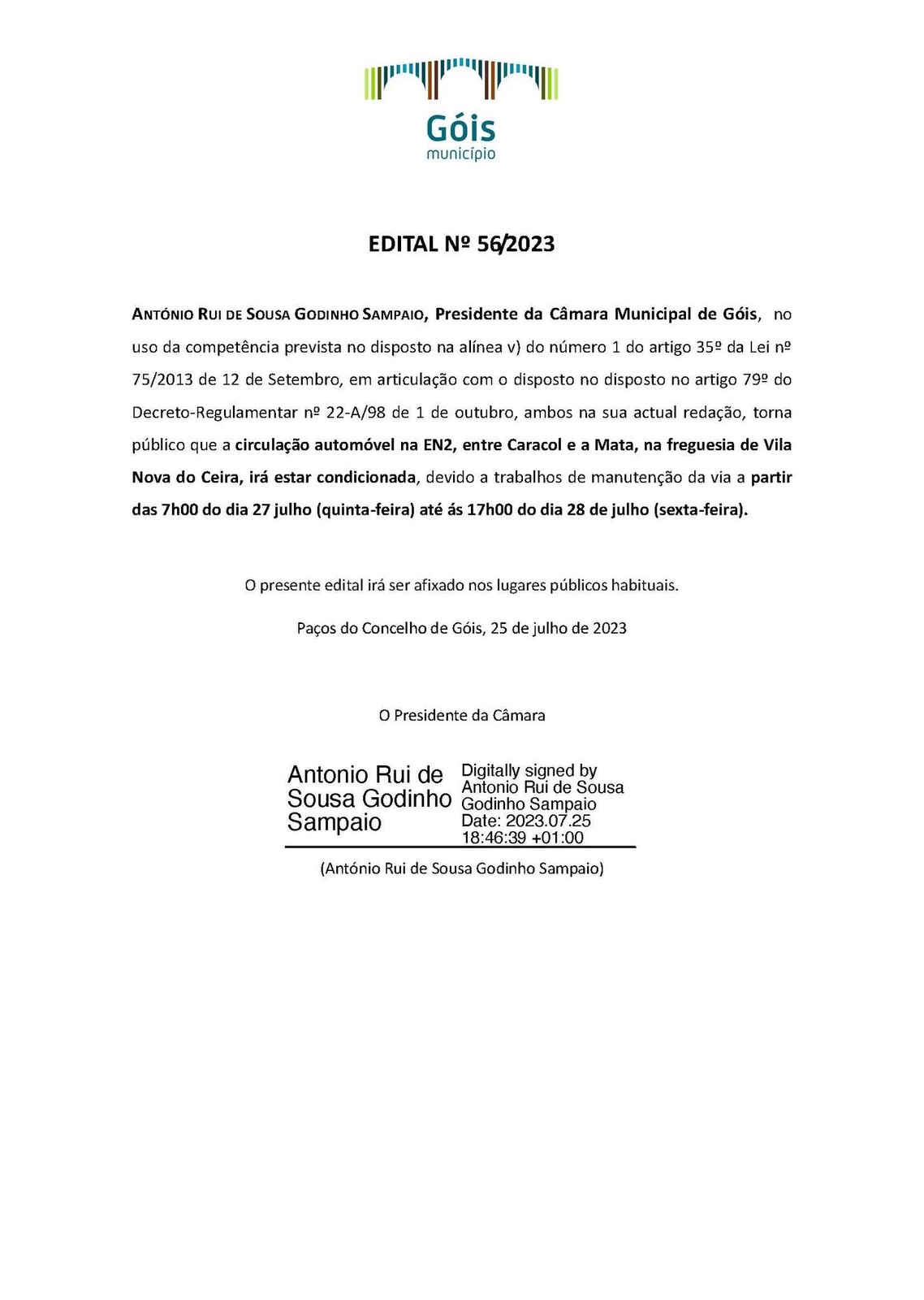 ANTÓNIO RUI DE SOUSA GODINHO SAMPAIO, Presidente da Câmara Municipal de Góis, no uso da competência prevista no disposto na alínea v) do número 1 do artigo 35º da Lei nº 75/2013 de 12 de Setembro, em articulação com o disposto no disposto no artigo 79º do Decreto-Regulamentar nº 22-A/98 de 1 de outubro, ambos na sua actual redação, torna público que a circulação automóvel na EN2, entre Caracol e a Mata, na Freguesia de Vila Nova do Ceira, irá estar condicionada, devido a trabalhos de manutenção da via a partir das 7h00 do dia 27 julho (quinta-feira) até às 17h00 do dia 28 de julho (sexta-feira).