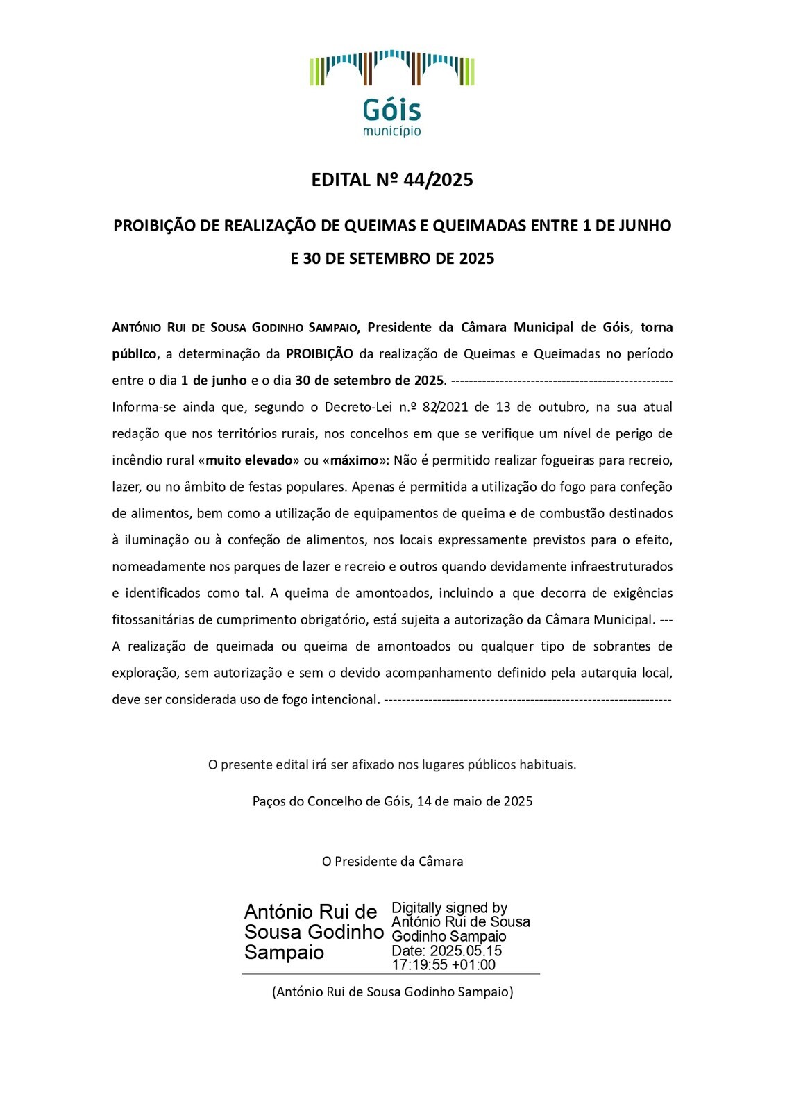 António Rui de Sousa Godinho Sampaio, Presidente da Câmara Municipal de Góis, torna público, a determinação da 𝐏𝐑𝐎𝐈𝐁𝐈ÇÃ𝐎 da realização de Queimas e Queimadas no período entre o dia 𝟏 𝐝𝐞 𝐣𝐮𝐧𝐡𝐨 𝐞 𝐨 𝐝𝐢𝐚 𝟑𝟎 𝐝𝐞 𝐬𝐞𝐭𝐞𝐦𝐛𝐫𝐨 𝐝𝐞 𝟐𝟎𝟐𝟓.
