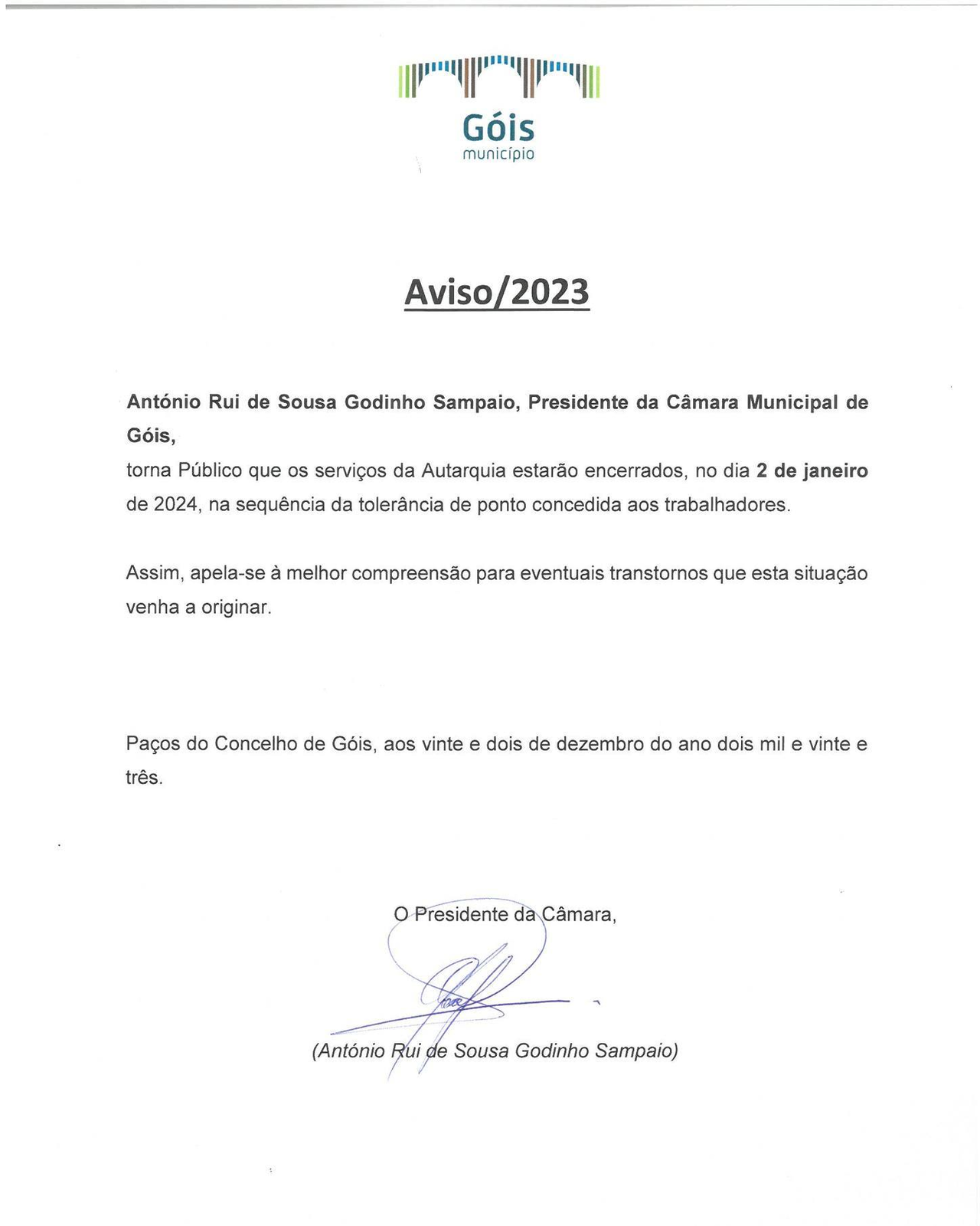 O Município de Góis torna público que os serviços da autarquia estarão encerrados, no dia 2 de janeiro de 2024, na sequência da tolerância de ponto concedida aos trabalhadores.
