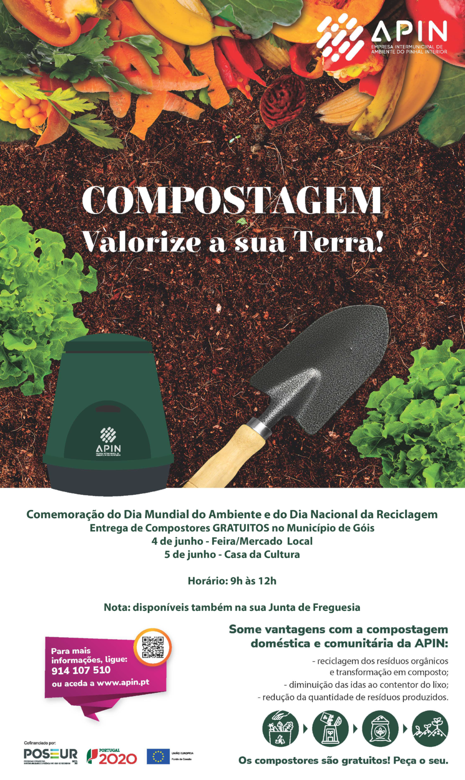O Município de Góis, em parceria com a APIN, e no âmbito da comemoração do Dia Mundial do Ambiente e do Dia Nacional da Reciclagem (5 de junho), irá entregar, gratuitamente, compostores nos seguintes locais:
