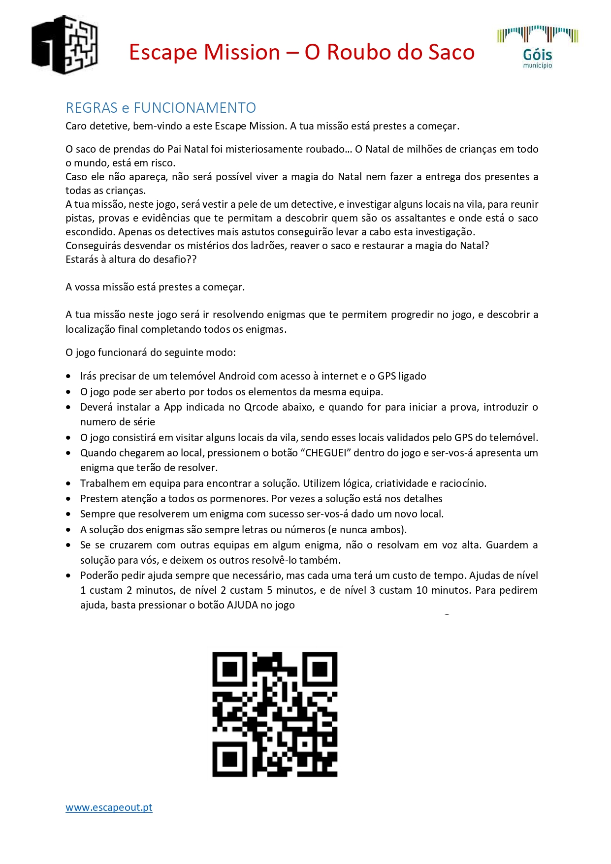 ℹ Para mais informações consulte o Posto de Turismo Municipal e/ou o seguinte link: https://www.cm-gois.pt/.../gois-escape-mission-o-roubo-do...