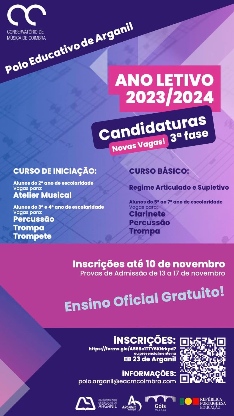 Está aberta uma nova fase de candidaturas para a frequência do Ensino Artístico Especializado no Pólo Educativo de Arganil da Escola Artística do Conservatório de Música de Coimbra.