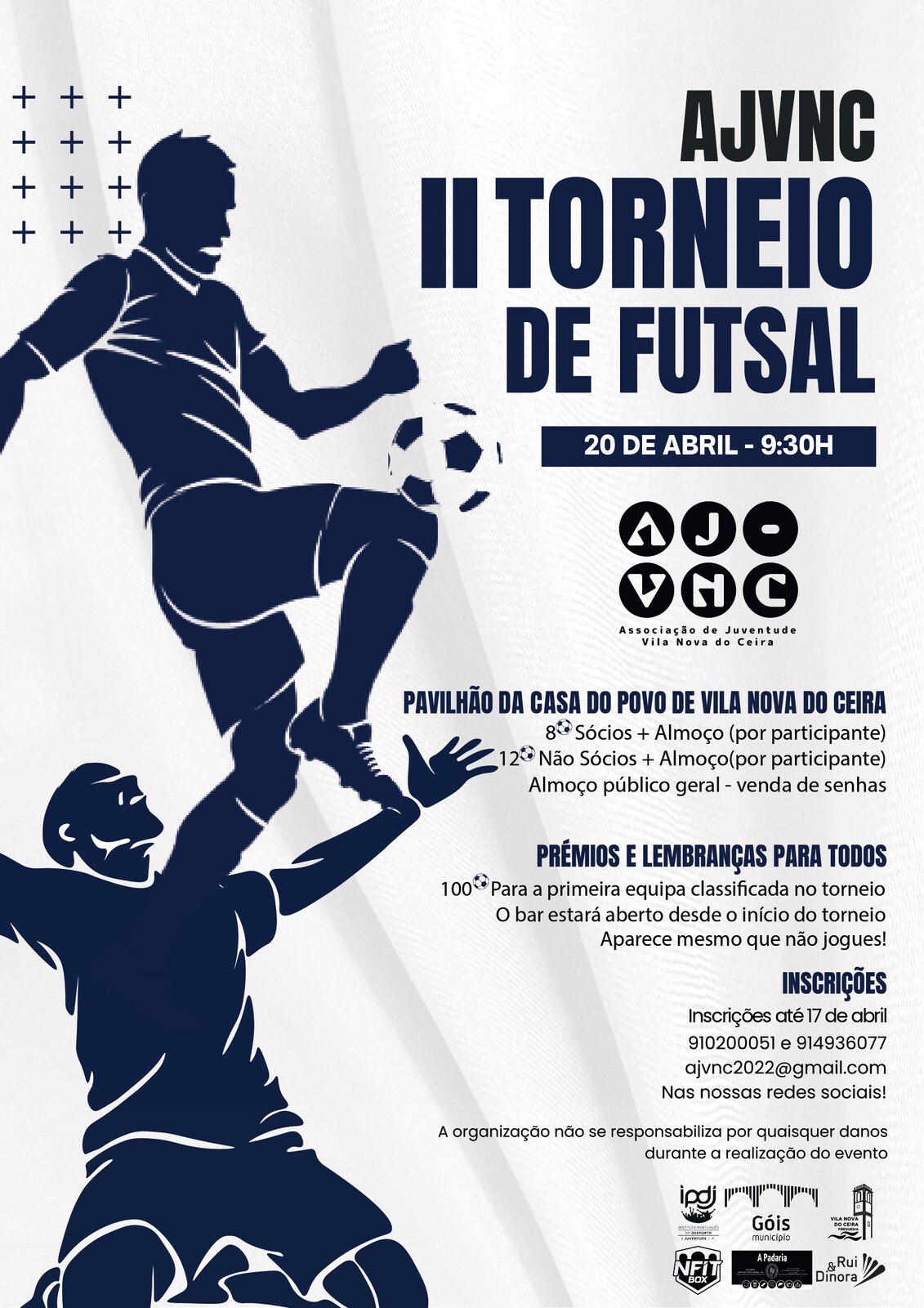 A Associação de Juventude de Vila Nova do Ceira promove o 2° Torneio de Futsal, que irá realizar-se no dia 20 de Abril, pelas 09h30, no Pavilhão da Casa do Povo de Vila Nova do Ceira.