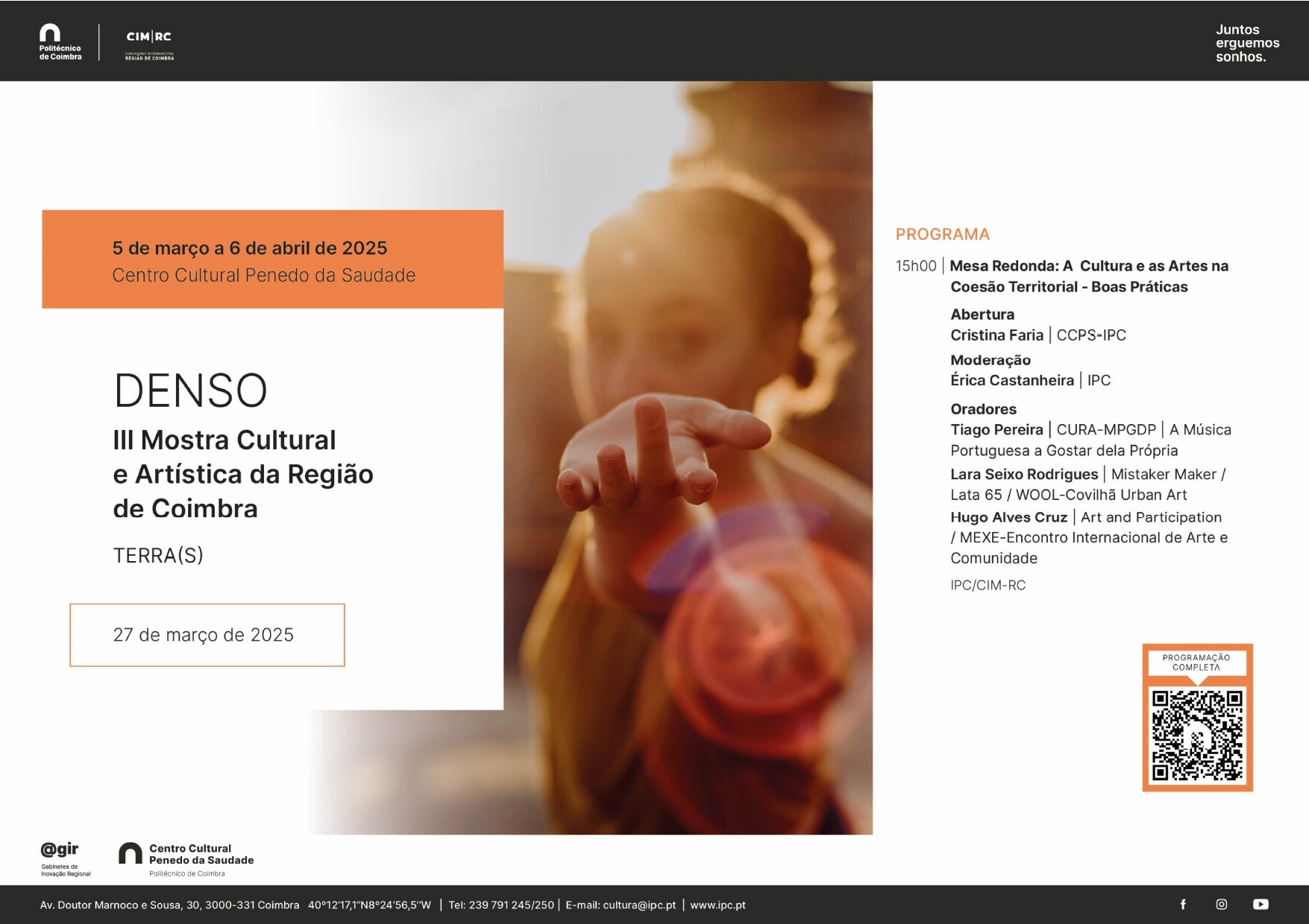 O Município de Góis divulga a iniciativa do Politécnico de Coimbra - IPC, no âmbito da 𝐃𝐄𝐍𝐒𝐎 – 𝐈𝐈𝐈 𝐌𝐨𝐬𝐭𝐫𝐚 𝐂𝐮𝐥𝐭𝐮𝐫𝐚𝐥 𝐞 𝐀𝐫𝐭í𝐬𝐭𝐢𝐜𝐚 𝐝𝐚 𝐑𝐞𝐠𝐢ã𝐨 𝐝𝐞 𝐂𝐨𝐢𝐦𝐛𝐫𝐚, promovida pela Comunidade Intermunicipal da Região de Coimbra, com as seguintes mesas-redondas: