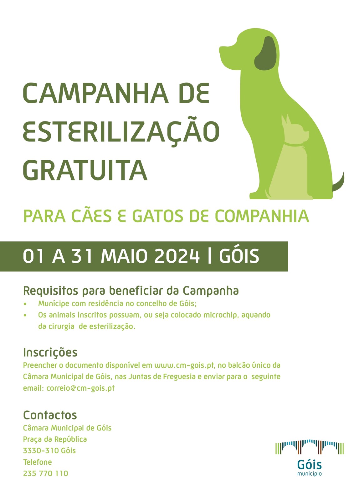 A Câmara Municipal de Góis, seguindo as recomendações da Lei n.º 27/2016, de 23 de Agosto, que privilegia a esterilização como forma de controlo da população de animais errantes, promove uma nova Campanha de Esterilização gratuita de animais de companhia, que irá decorrer de 1 de Maio até ao dia 31 de Maio de 2024, sendo as intervenções cirúrgicas efetuadas em Centro de Atendimento Médico-Veterinário da região.