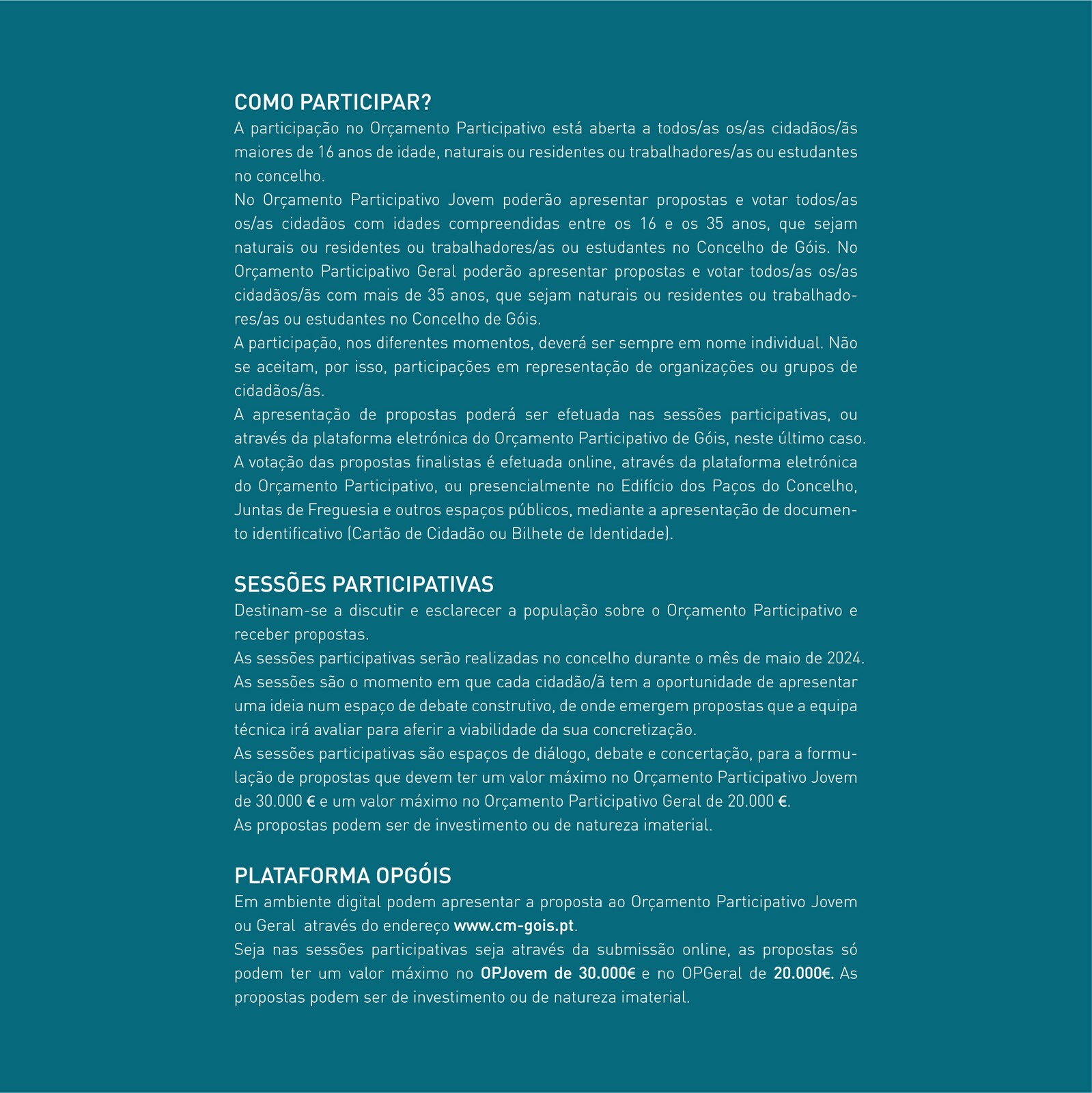 Para participares tens que ser cidadão/ã natural ou residente ou trabalhador/a ou estudante do concelho de Góis.