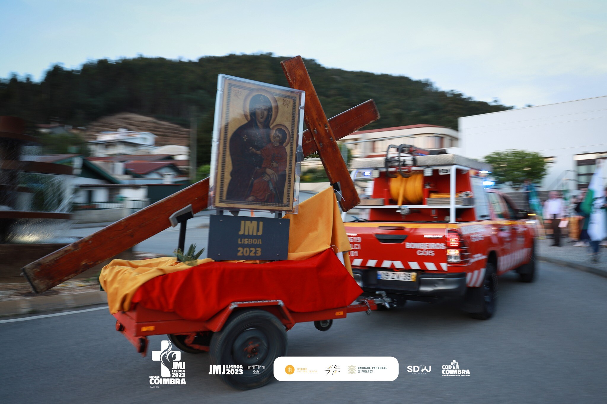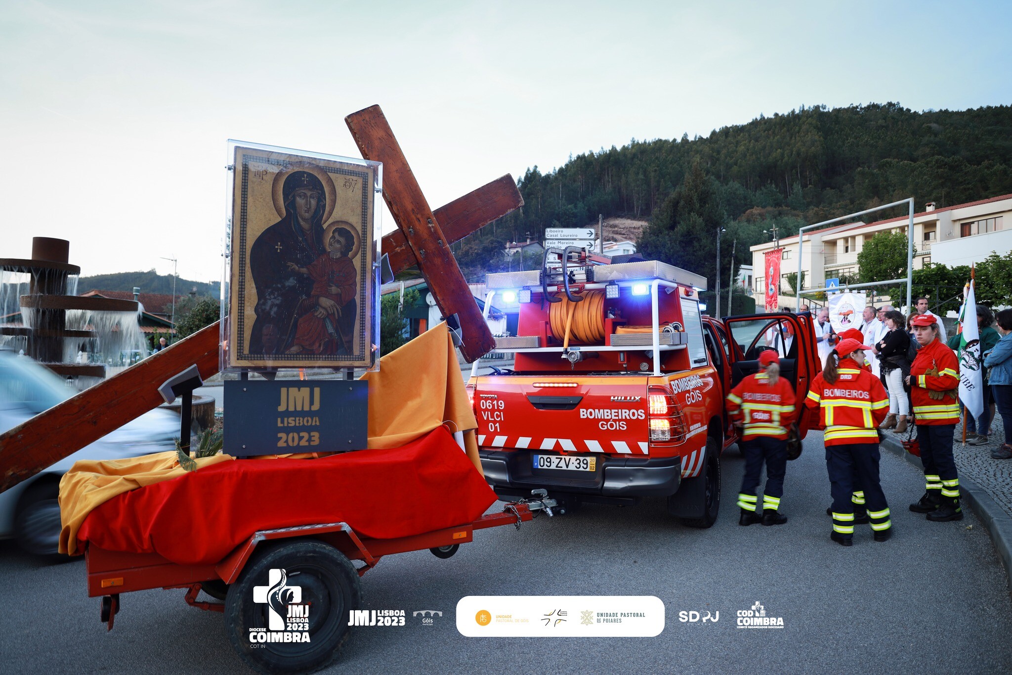 A Cruz Peregrina e o ícone de Nossa Senhora “Salus Populi Romani” foram acolhidos pelo COT iN e pela comunidade Goiense na Sarnoa, ramal de Celavisa, esta segunda-feira, pelas 19h30, onde decorreu o cortejo dos símbolos, pela EN342 até à Vila de Góis, em colaboração com os Bombeiros Voluntários de Góis, GNR e Câmara Municipal de Góis.