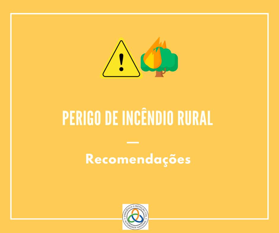 A Autoridade Nacional de Emergência e Proteção Civil recomenda a adequação dos comportamentos e atitudes face à situação de perigo de incêndio rural, nomeadamente a adoção das necessárias medidas de prevenção e precaução, de acordo com a legislação em vigor, e tendo especial atenção à evolução do perigo de incêndio neste período.