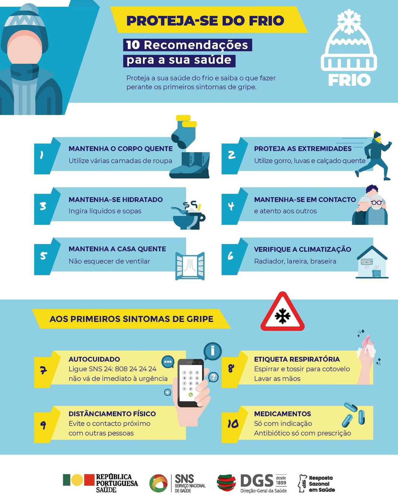 Face à previsão, por parte do Instituto Português do Mar e da Atmosfera, de temperaturas muito baixas para os próximos dias, proteja a sua saúde do frio e saiba o que fazer perante os primeiros sintomas de gripe.