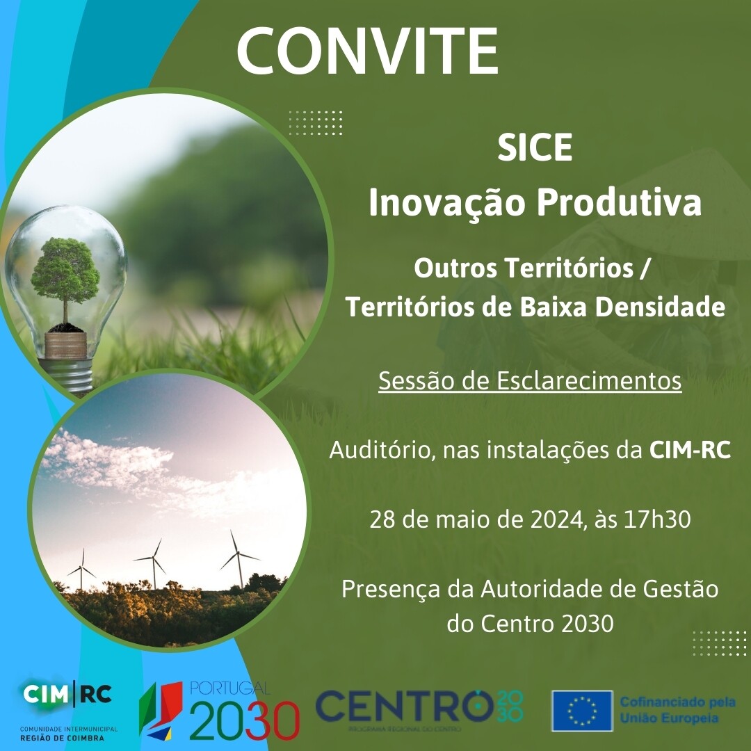 No seguimento da Candidatura do Portugal 2030 Sistemas de Incentivos às empresas (SICE) – Inovação Produtiva Territórios de Baixa Densidade/Outros Territórios e por forma a impulsionar o investimento empresarial e o reforço da competitividade externa, através da diferenciação, diversificação e inovação, a Comunidade Intermunicipal da Região de Coimbra irá realizar uma Sessão de Esclarecimentos, na sede da CIM-RC, dia 28 de maio de 2024, terça-feira, às 17h30 que contará com a presença da AG do Centro 2030.