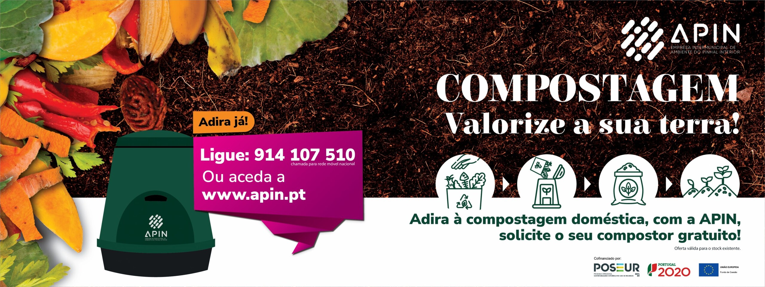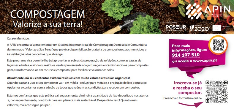 👉 Desta forma, a APIN encontra-se a implementar um Sistema Intermunicipal de Compostagem Doméstica e Comunitária, denominado “Valorize a Sua Terra”, que prevê a distribuição gratuita de 27.504 compostores domésticos e 116 compostores comunitários em alojamentos, estabelecimentos de ensino, IPSS e centros operacionais da APIN. Esta distribuição é acompanhada por sessões de sensibilização e formação sobre metodologia e benefícios da compostagem doméstica, assim como a distribuição de um guia de compostagem.